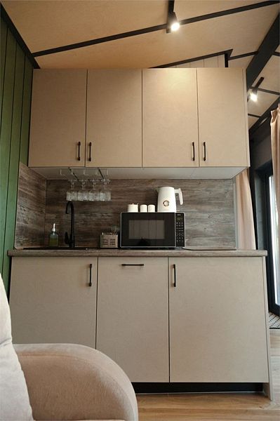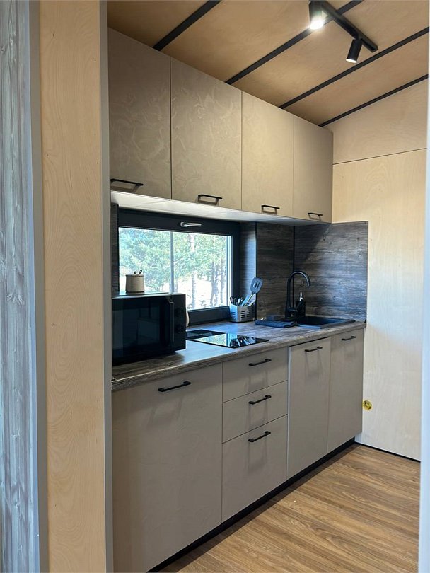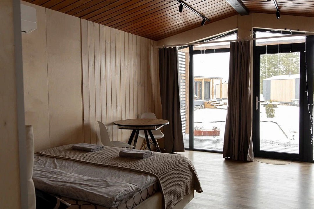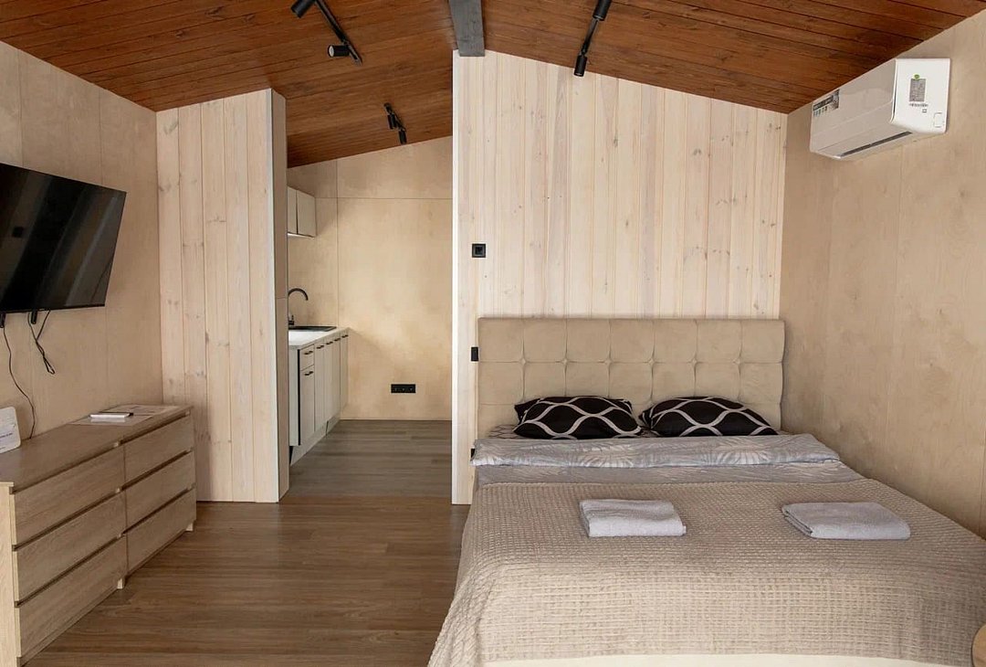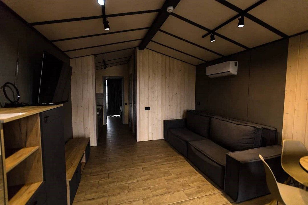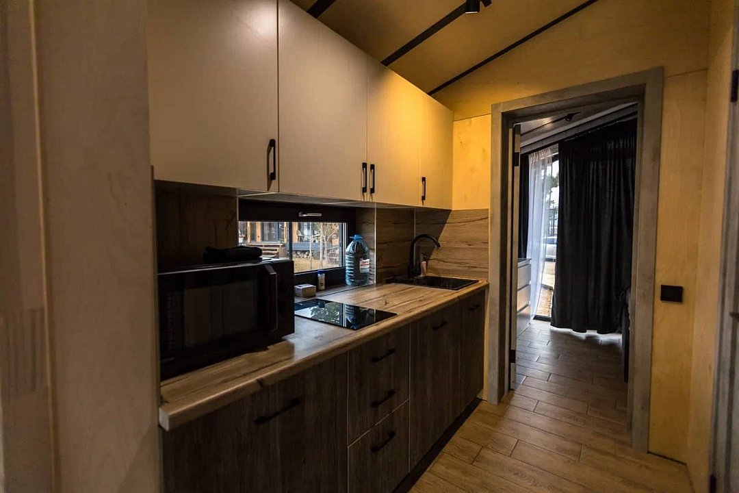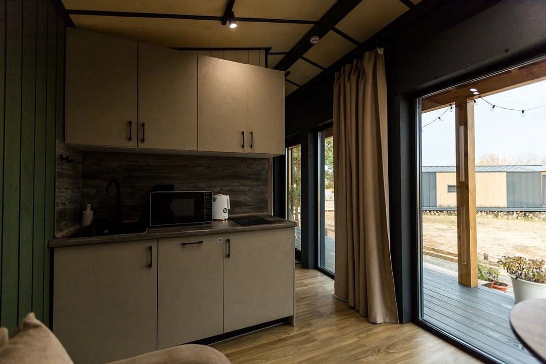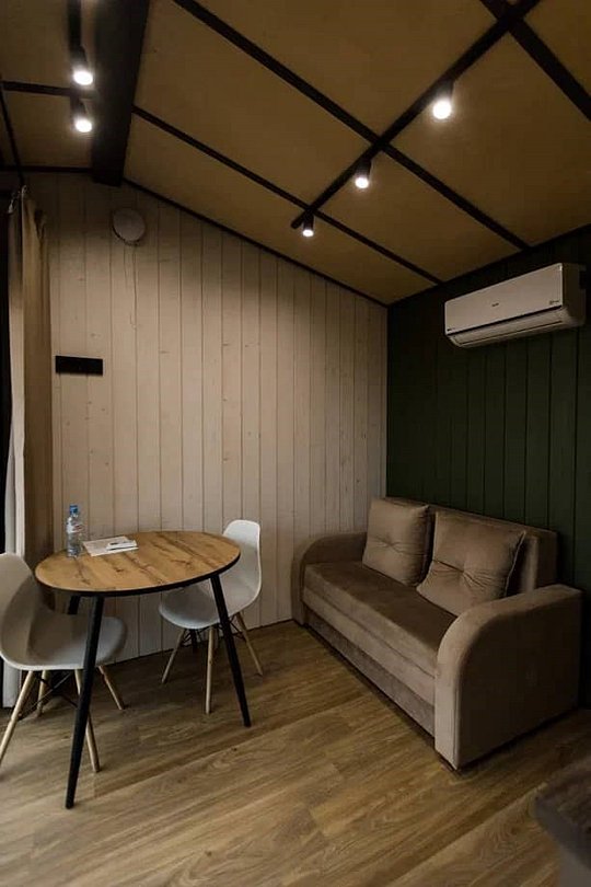 Дом MINI — компактный уют для семьи Уютный домик с продуманной планировкой — идеален для семейного отдыха. Дом MINI подходит для комфортного размещения до 4 человек. В доме: Изолированная спальня с двуспальной кроватью (160 см) Кухонная зона с раскладным диваном (спальное место 140 см) — удобно для двух детей Полноценная кухня: посудомоечная машина, плита, микроволновка, холодильник, посуда Санузел и душ внутри дома ❄️ Теплый пол, уют в любую погоду Уютная терраса и мангал — для ужинов на свежем воздухе Этот формат идеально подойдёт для пары с детьми или небольшой компании. Все условия для отдыха с комфортом — как дома, но ближе к природе.Услуги и удобства