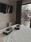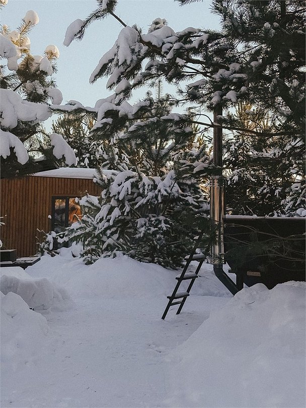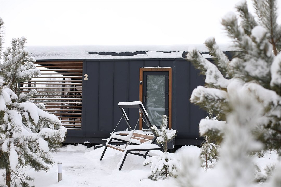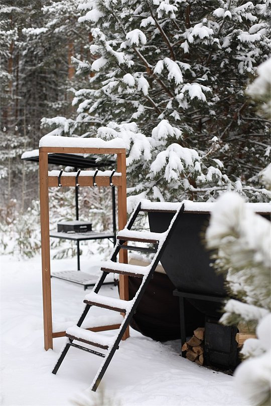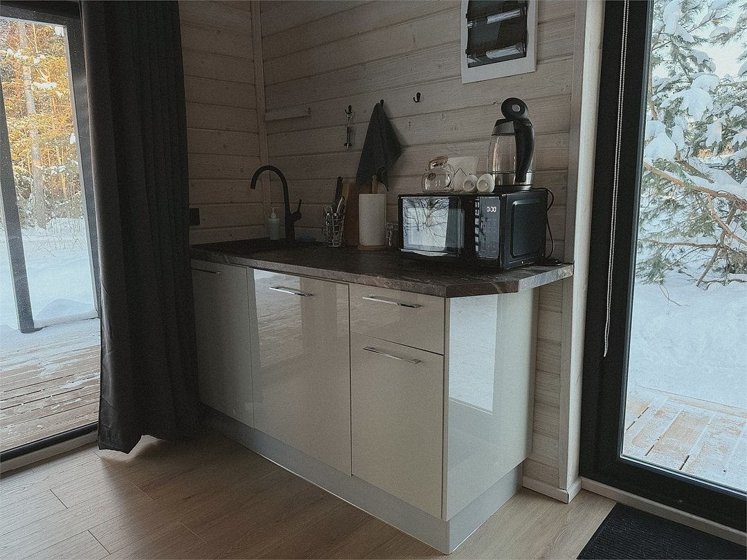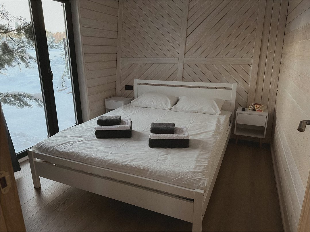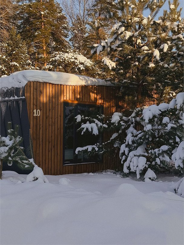 Стильный дом с видом на сосновый лес укроет Вас от лишних взглядов и позволит перезагрузиться в тишине и спокойствии. Рядом с каждым домом располагается чан и мангал с решеткой для барбекю. Не теряя ощущение уединенности, Вы сможете согреться в чане даже в самую холодную погоду. Наши сотрудники сами подготовят его для Вашего комфорта. Пребывание в чане успокаивает нервную систему, расслабляет мышцы и улучшает кровообращение. После него Вы почувствуете себя свежим и обновленным. Дом рассчитан на пребывание от двух до четырех человек. Несмотря на свои размеры, в доме есть всё необходимое - большая двуспальная кровать, кухня, ванная, обеденный стол.Услуги и удобства