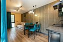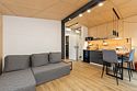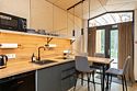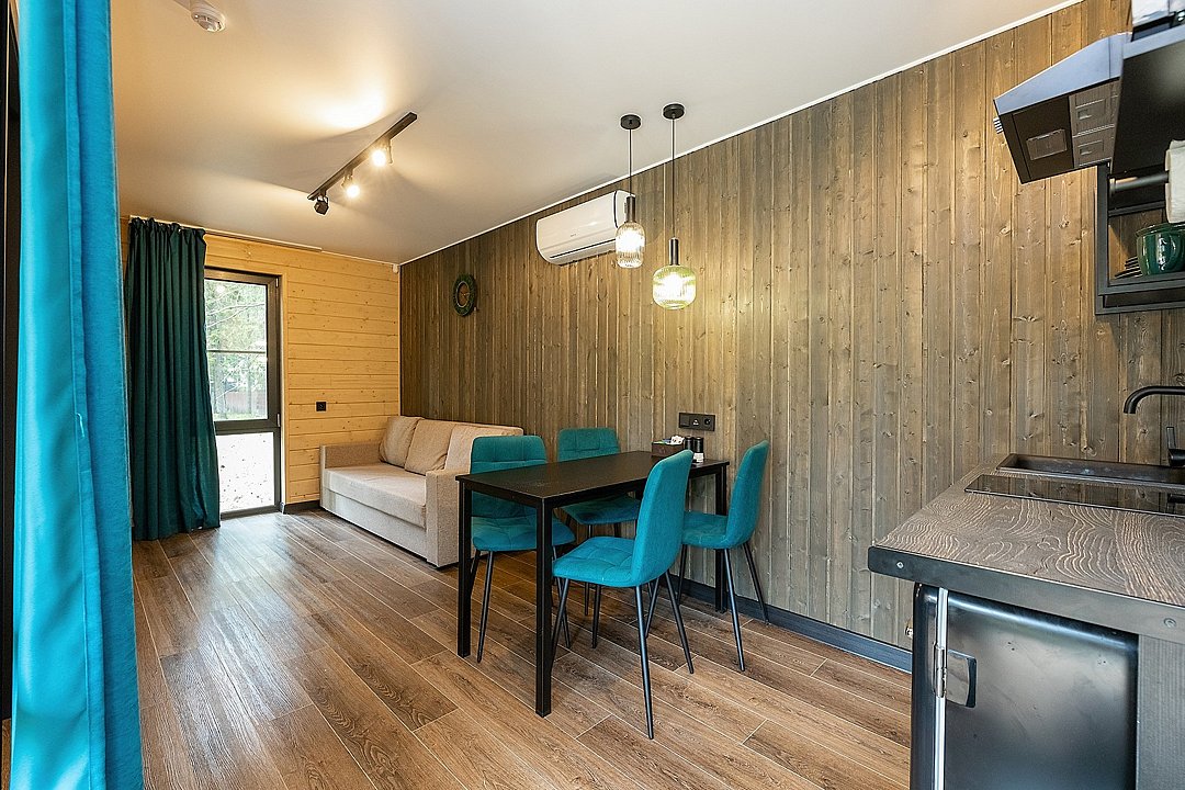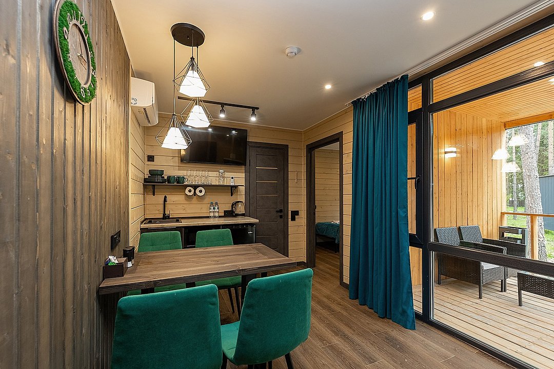 Мини-Дом по типу «Тинихаус» отлично подходит для отдыха небольшой компанией для тех, кто любит уютные пространства и получает удовольствие от оптимизации места и нестандартных решений. Панорамное окно из гостиной открывают вид на сосновый лес и извилистые дорожки глэмпинга.Услуги и удобства