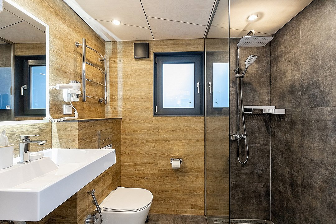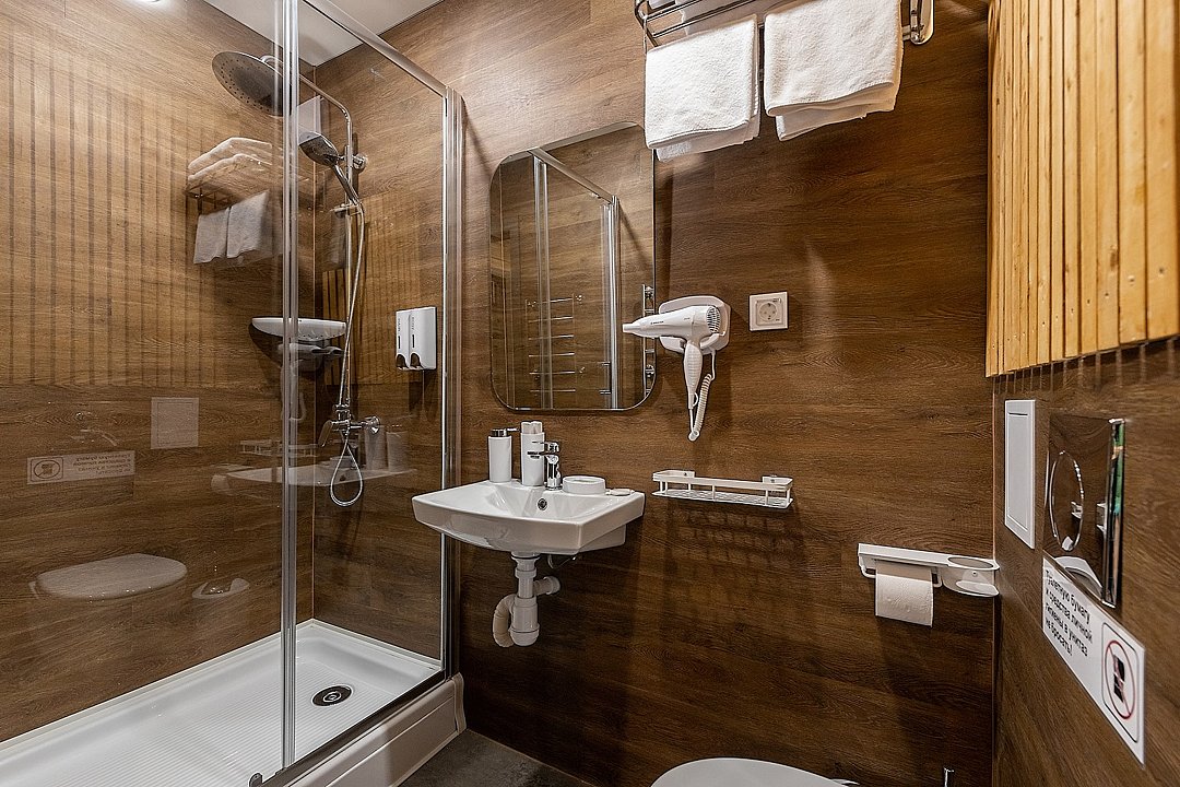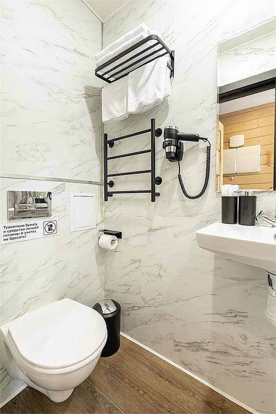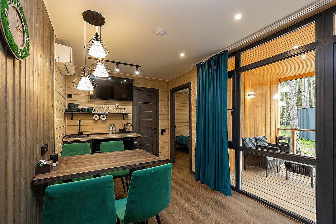 Wi-Fi, кондиционер, фен, микроволновая печь, душевая кабина, санузел, терраса, двуспальная кровать, две односпальные кровати, стулья, шкаф для одежды, вешалки, обеденный стол, набор посуды, сейф, чайник, раковина, питьевая вода, душ, кухонная посуда, стаканы, столовые приборы, стул, стол, туалетные средства, панорамные окна, мини-холодильник, мини-кухня, телевизор со Smart TV, теплые полы, вид на лес, бутилированная вода, мылоВ доме