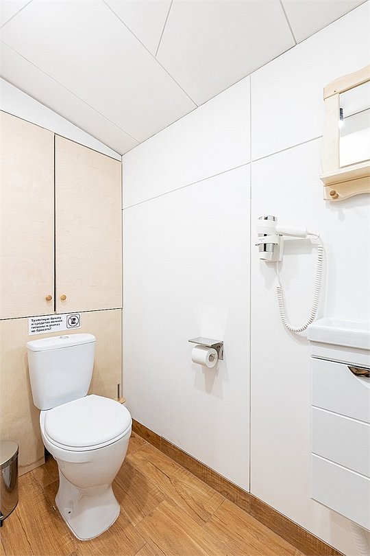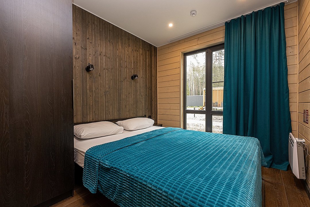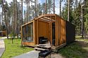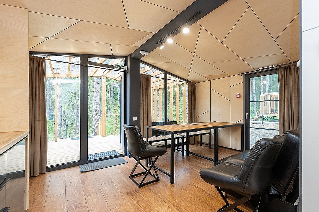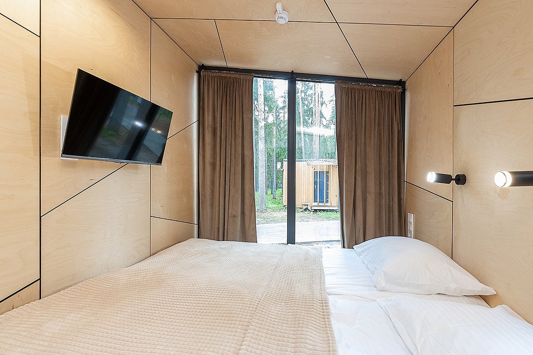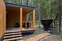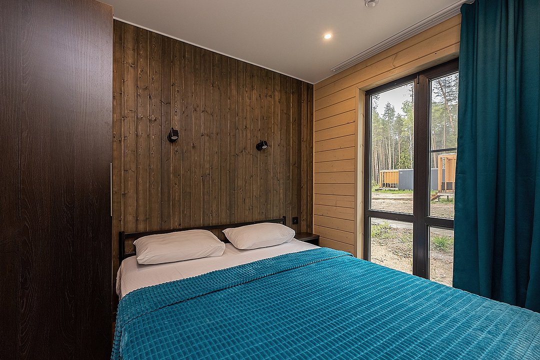 Дом по типу «Тинихаус» отлично подходит для отдыха вдвоем тем, кто любит небольшие уютные пространства и получает удовольствие от оптимизации места и нестандартных решений. Панорамное окно из гостиной открывают вид на сосновый лес и извилистые дорожки глэмпинга.Услуги и удобства