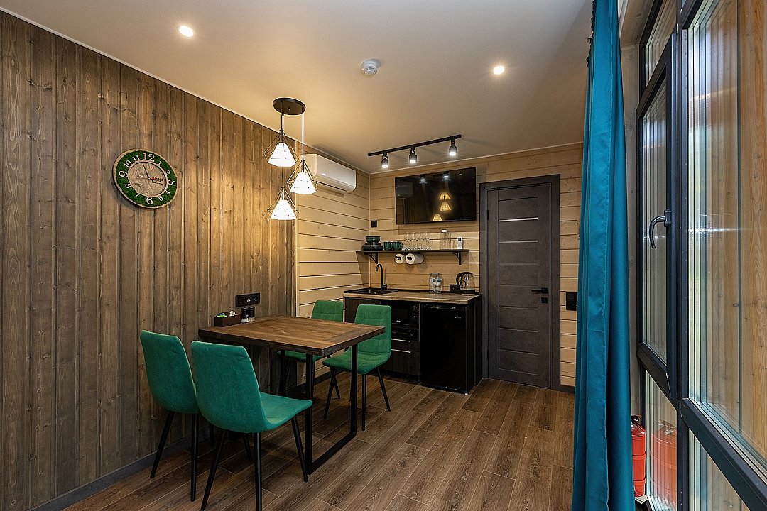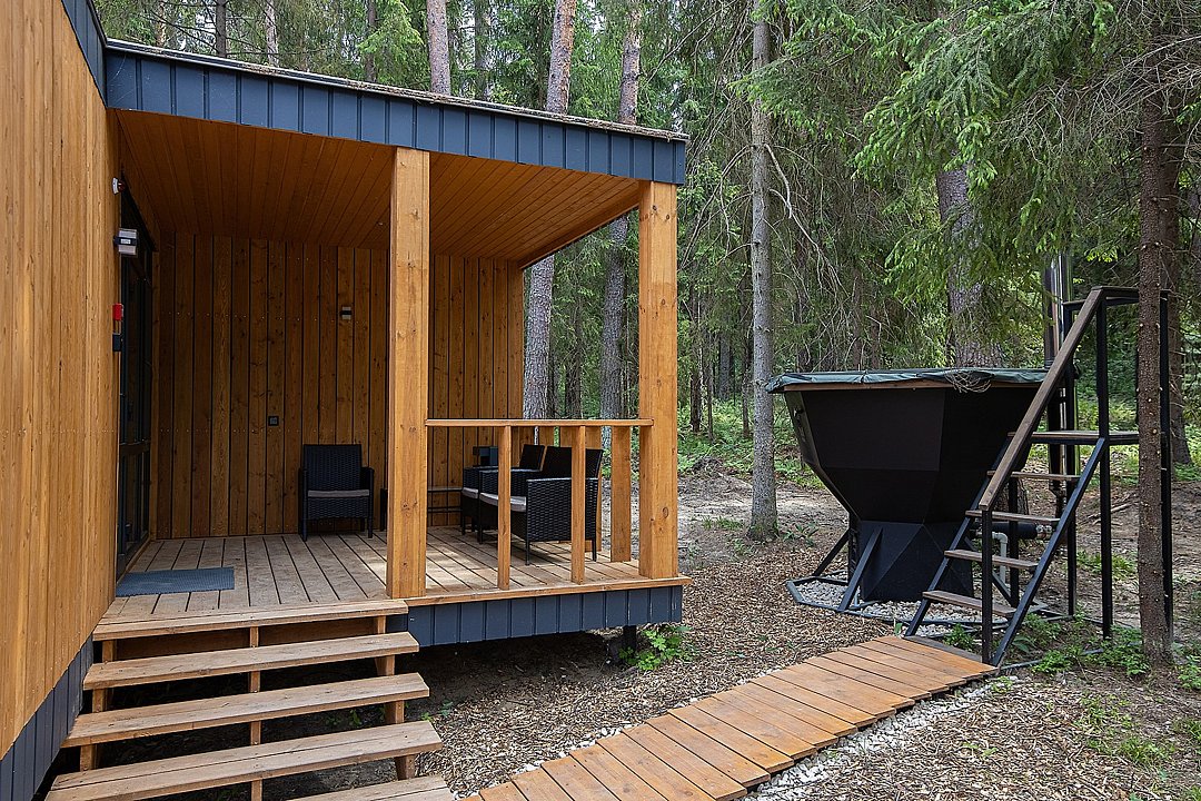 Мини-Дом с чаном по типу "Тинихаус" отлично подходит для отдыха небольшой компанией для тех, кто любит уютные пространства и получает удовольствие от оптимизации места и нестандартных решений. Панорамное окно из гостиной открывает вид на сосновый лес и извилистые дорожки глэмпингаУслуги и удобства