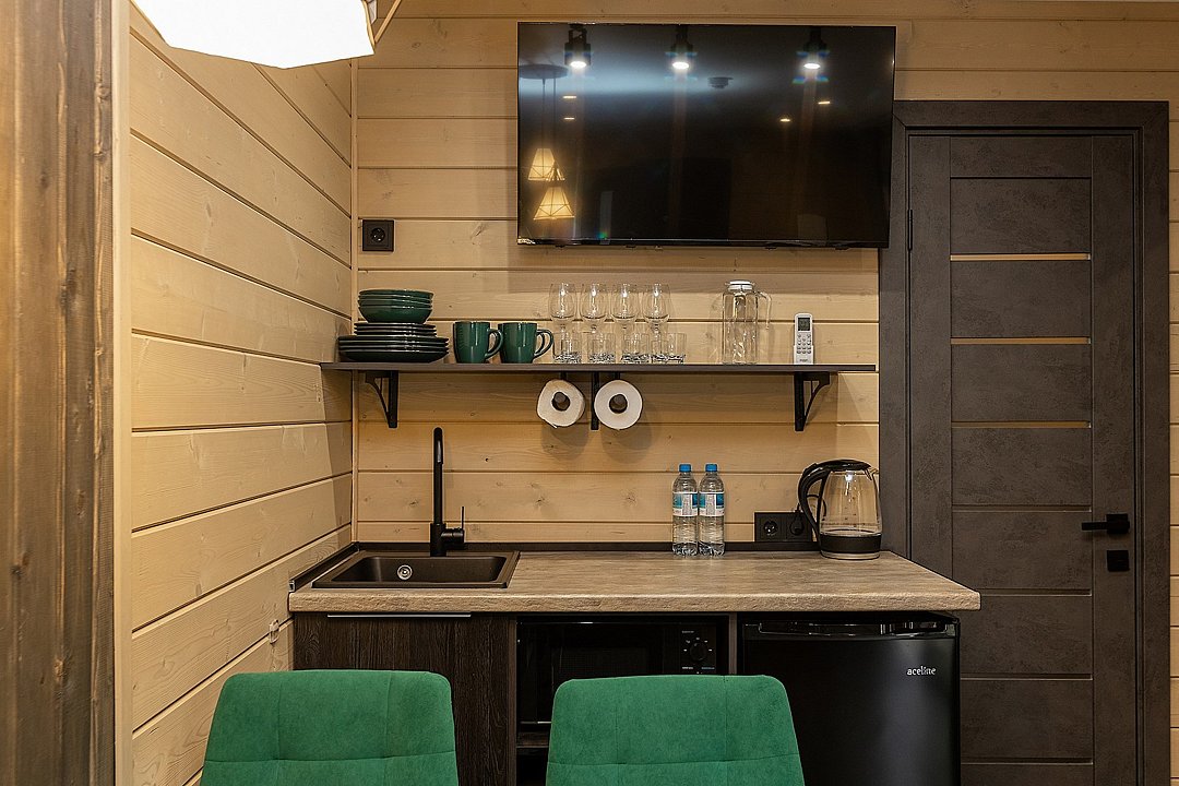 Wi-Fi, фен, банные принадлежности, тапочки, сауна, терраса, стулья, вешалки, обеденный стол, чайный набор, набор посуды, чайник, раковина, питьевая вода, кухонная посуда, стаканы, стол, туалет, диван-кровать, раскладной диван, мини-холодильник, мини-кухня, кухонный уголок, телевизор со Smart TV, теплые полы, вид на лес, бутилированная вода, мыло, затемняющая штора, без питомцев, баняВ домике