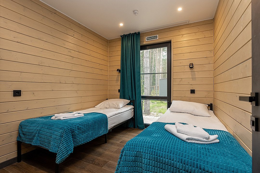 Тинихаус «Семейный»Дом по типу «Тинихаус» отлично подходит для отдыха небольшой компанией для тех, кто любит уютные пространства и получает удовольствие от оптимизации места и нестандартных решений. Панорамное окно из гостиной открывают вид на сосновый лес и извилистые дорожки глэмпинга.Услуги и удобства