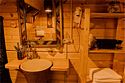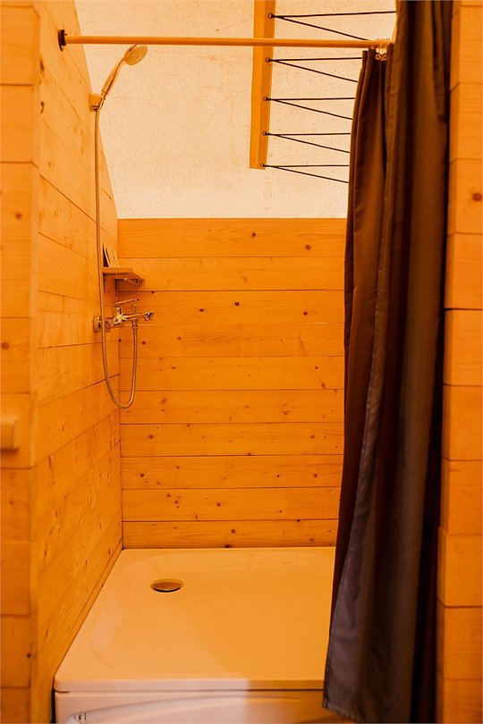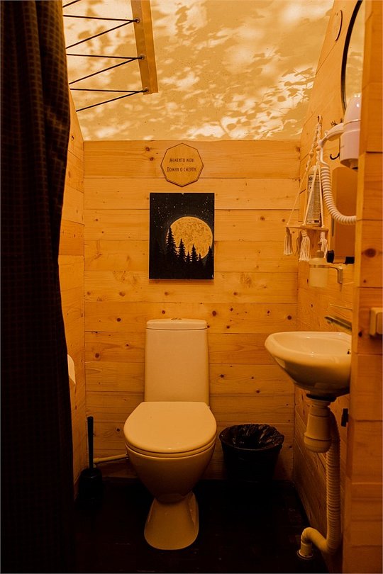 Санузел включает туалетную комнату с раковиной и отдельную душевую. Горячая вода подаётся от бойлера. Гостям предоставляются одноразовые предметы личной гигиены: зубной набор, шампунь, тапочки, полотенца для рук и тела.