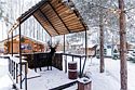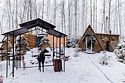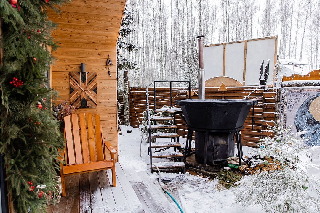Территория Дома приватная, безлимитный чан (топит чанный мастер) со своим веником запрещено, крытая беседка a-frame, очаг, мангал-олень, качель.