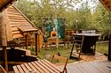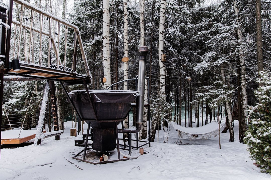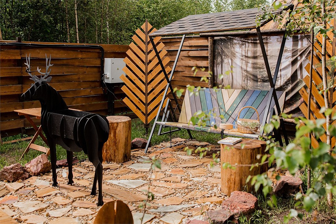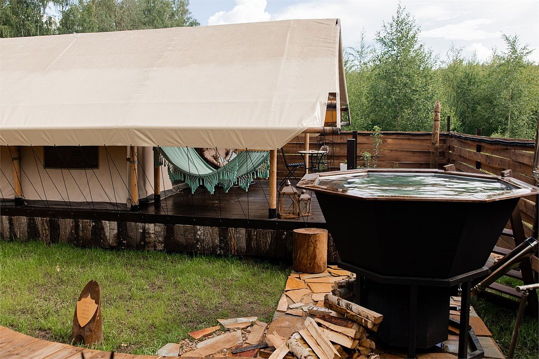 Территория сафари-тента приватная: собственный двор, безлимитный чан с запасом дров (растапливает чанный мастер), качели, очаг для костра и отдельная мангальная зона.