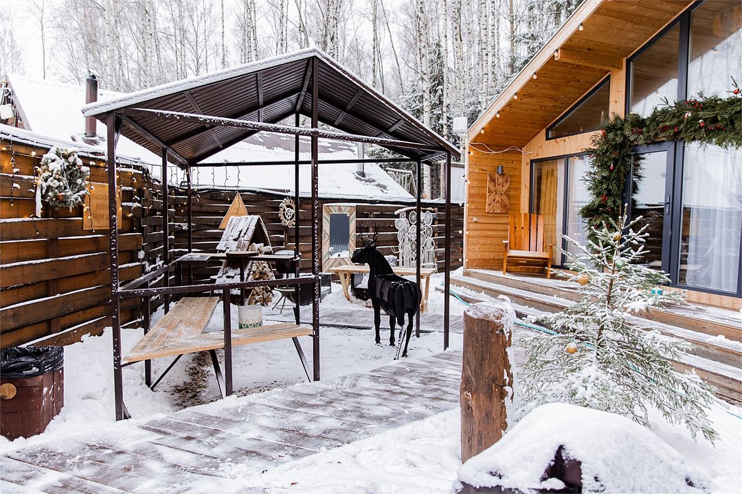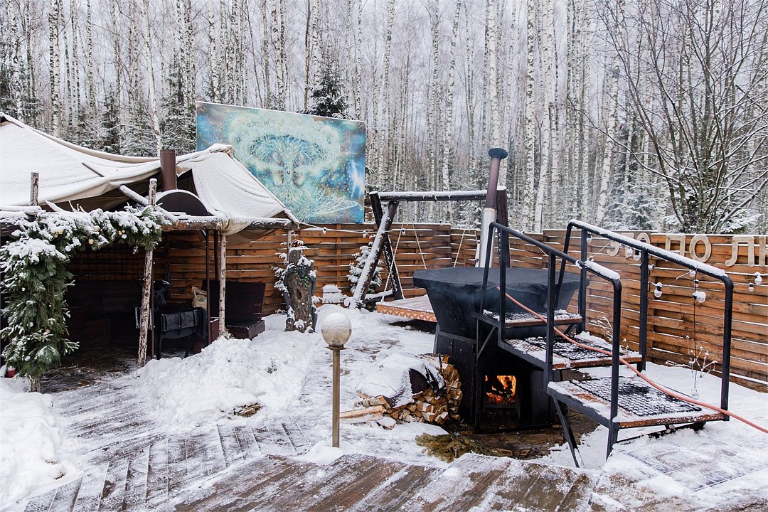 Приватная территория включает безлимитный чан (растапливает чанный мастер), закрытый двор, зону для костра, крытый мангал-олень, атмосферные фотозоны, тотемы и сказочное освещение.