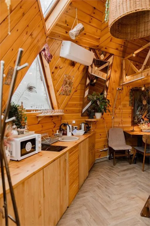 Мини-кухня, оборудованная всем необходимым. В наличии питьевая вода из скважины, базовый набор: масло, чай, сахар, соль.