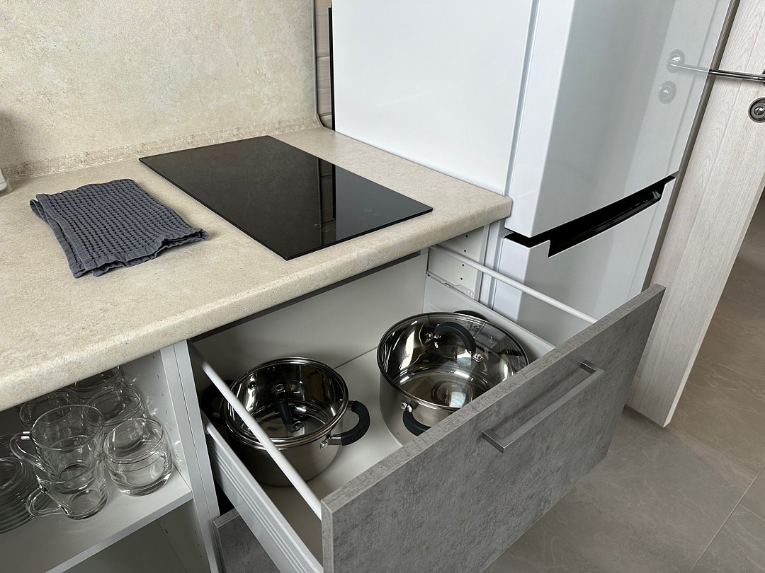 Коттедж полностью оборудован кухонными принадлежностями, а также техникой (холодильник, чайник, электроплита, посудомоечная машина, микроволновая печь.