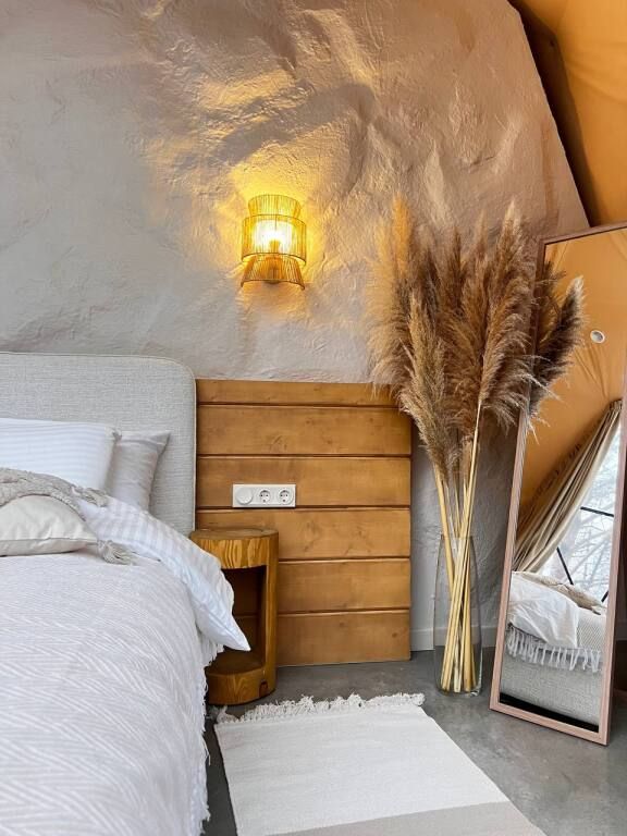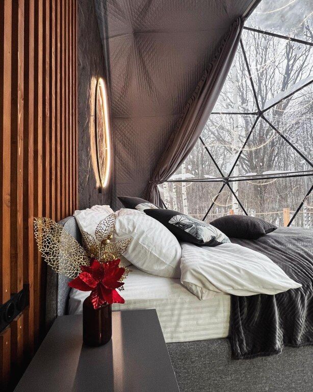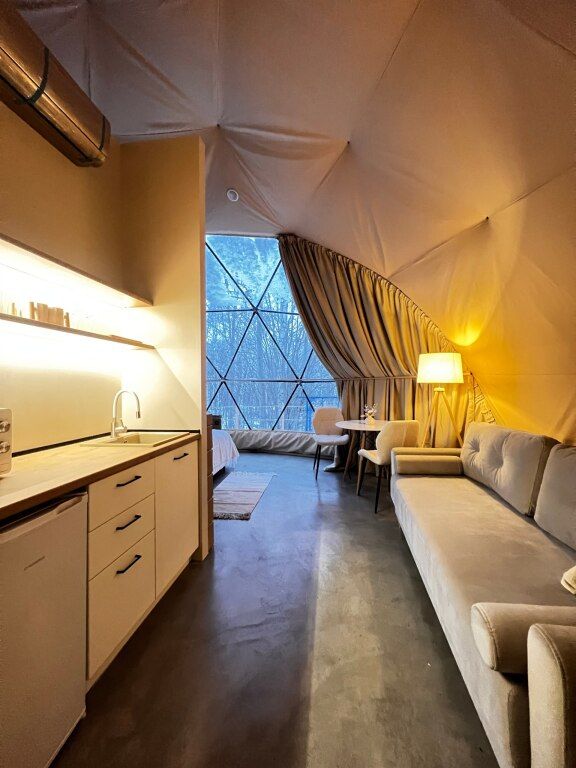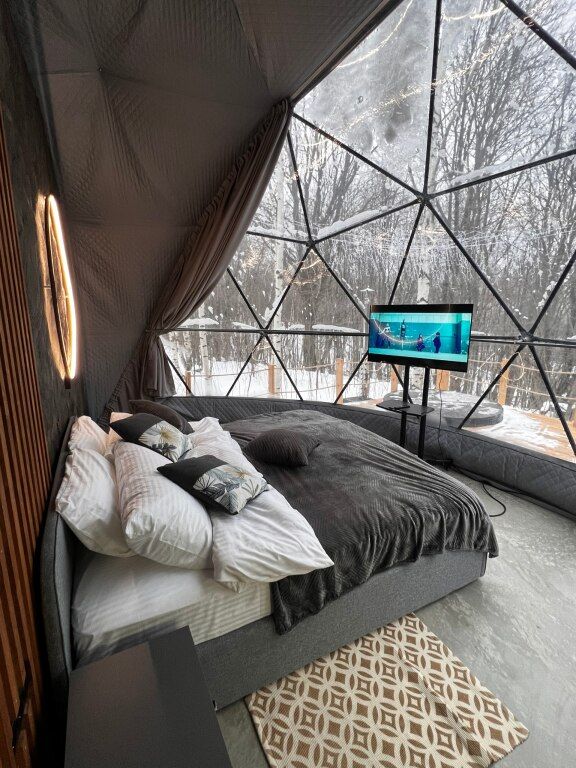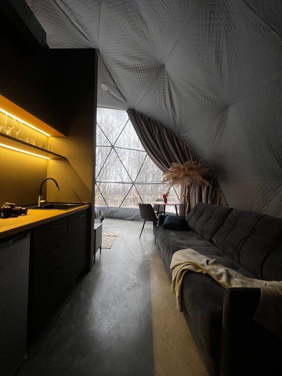 Для гостей оборудованы обеденная и кухонная зоны с необходимыми принадлежностями, имеются раскладной диван и просторная кровать, с которой открывается вид на территорию.
