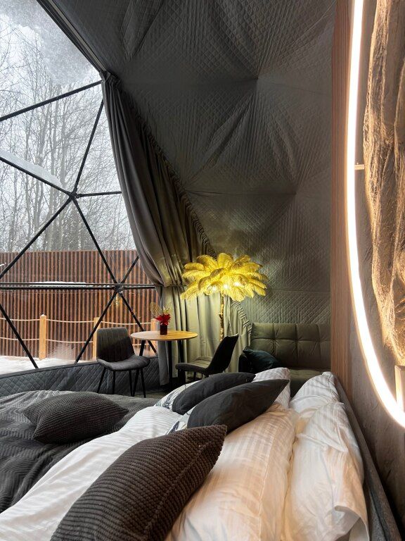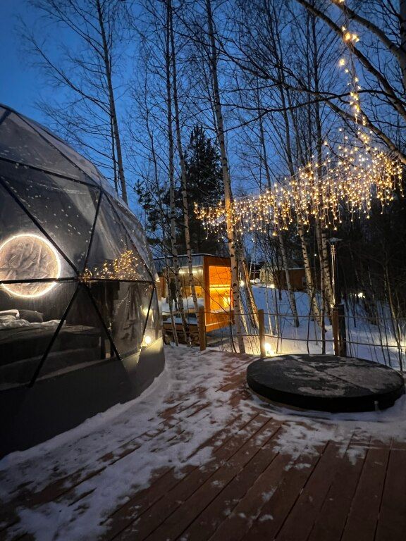 Глэмпинг «Хабарские дачи» находится в Дзержинске – представляет собой комплекс из двух домов-полусфер и подходит для семейного отдыха, романтических выходных и встречи с друзьями в нестандартной обстановке. На террасах установлены горячие купели. Территория вмещает баню на дровах с панорамным окном, беседку и профессиональный угольный гриль.