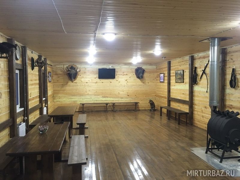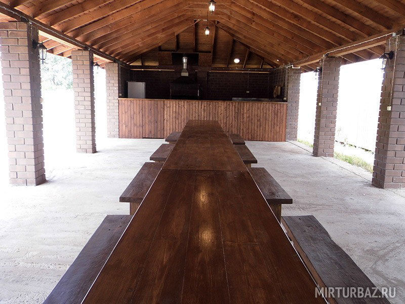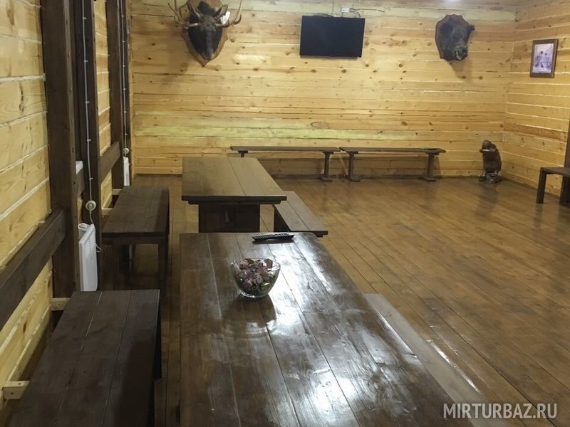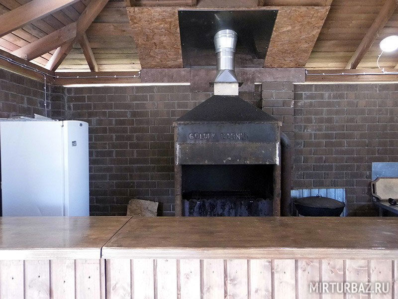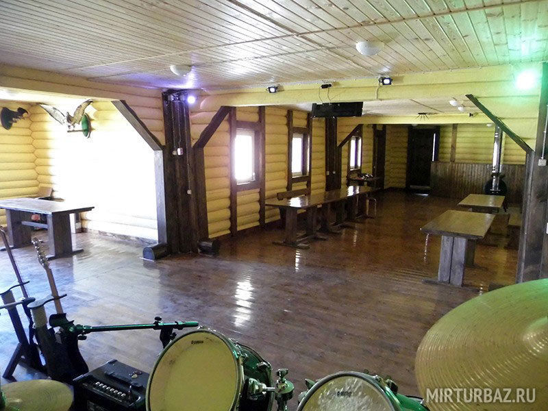 Вам будут предложены мангал, казан, живой звук в исполнении профессиональных артистов. Так же здесь имеются барная стойка, камин и сцена.