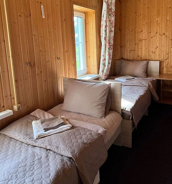 Представляют домики, разделённые на две половины, в каждый номер отдельный вход. В каждом номере три односпальных кровати, душ, санузел, чайник, холодильник (без морозильной камеры), телевизор.