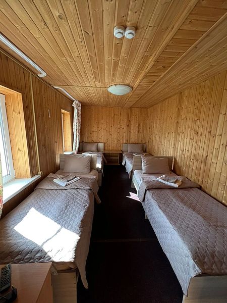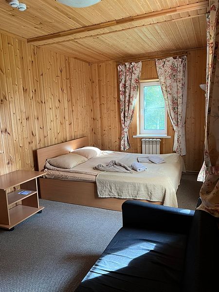 В номерах на первом этаже — от 3-х и до 5-ти односпальных кроватей, в номерах на втором этаже — двуспальная кровать и диван. В каждом номере душевая кабина или ванна, санузел, чайник, холодильник (без морозильной камеры), телевизор. Домики с номерами разделены на две половины, в каждый номер есть отдельный вход. В каждом номере двуспальная кровать, душ, санузел, чайник, холодильник, телевизор.