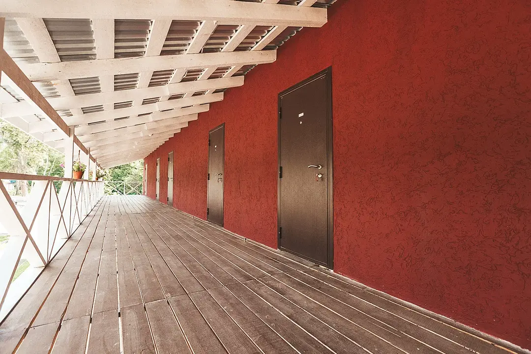 Номера находятся в двухэтажном корпусе, у каждого номера отдельный вход.
