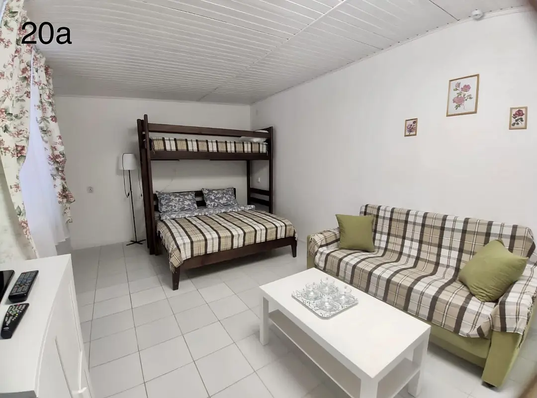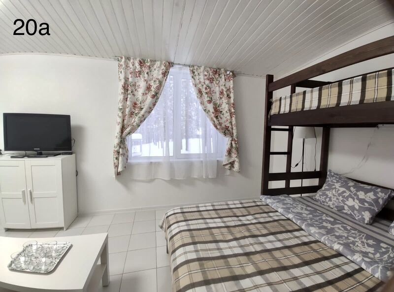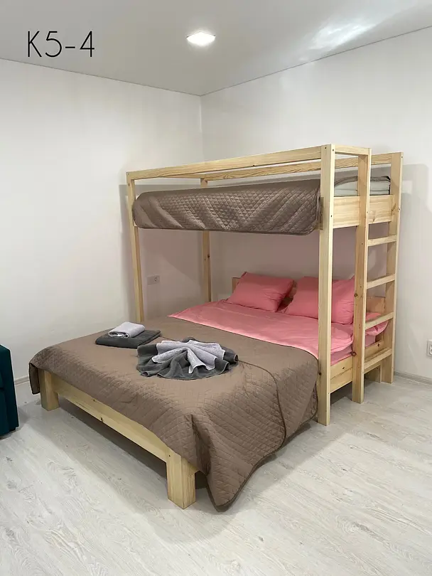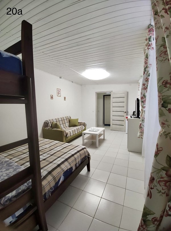 - Номер №20а — с двухспальной кроватью + детская кровать — чердак + диван.