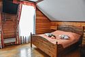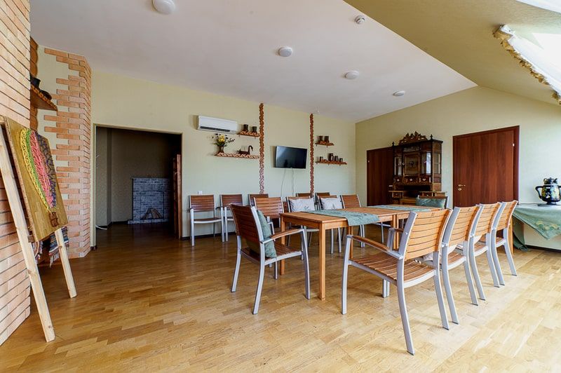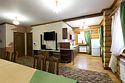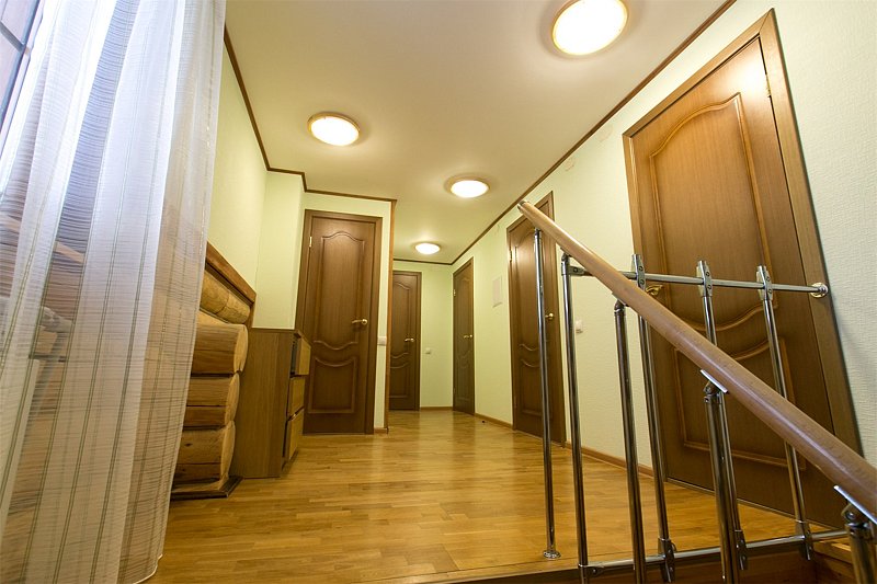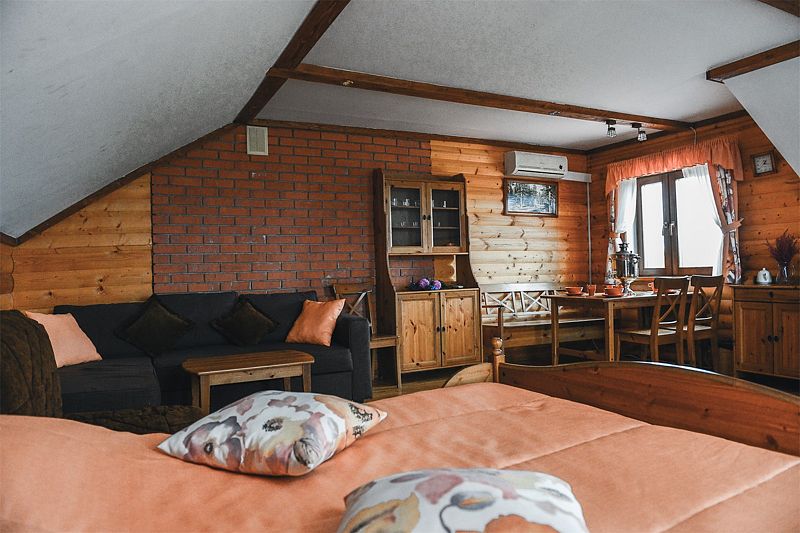 Дом оборудован современной кухней, большой гостиной – столовой с телевизором и музыкальной колонкой. Также на первом этаже находится сауна и бассейн. На верхнем этаже располагаются спальни. Общая вместимость коттеджа до 13 человек.