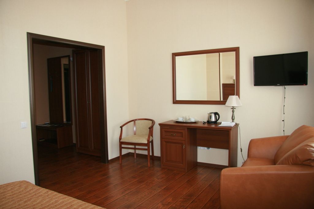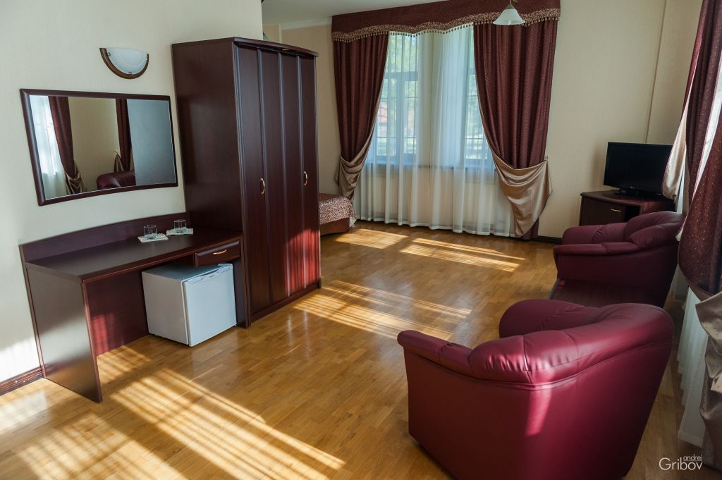 Просторный номер с зоной гостиной и спальни.