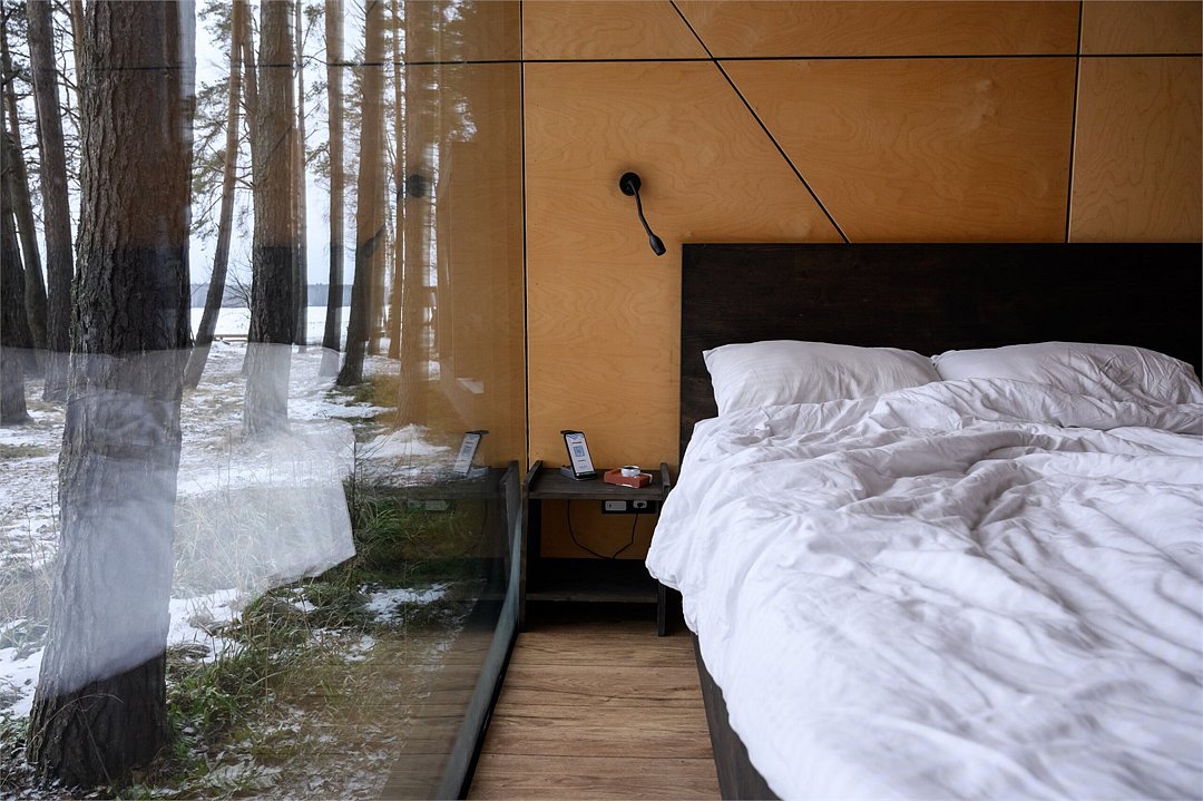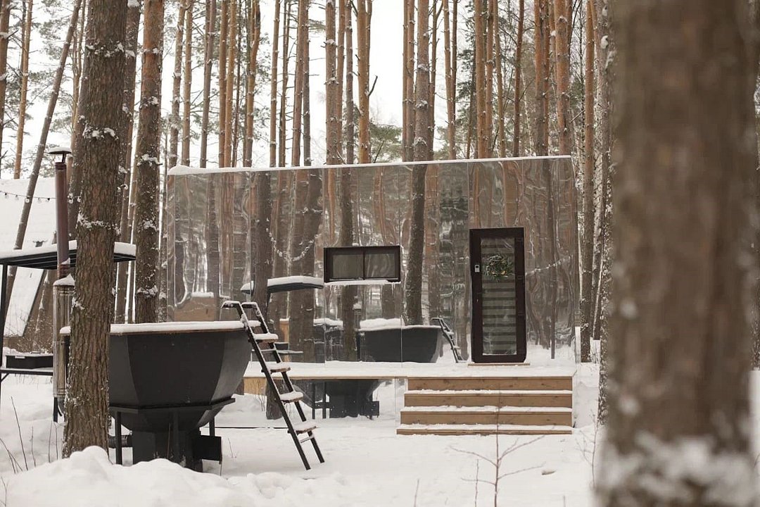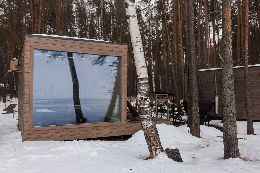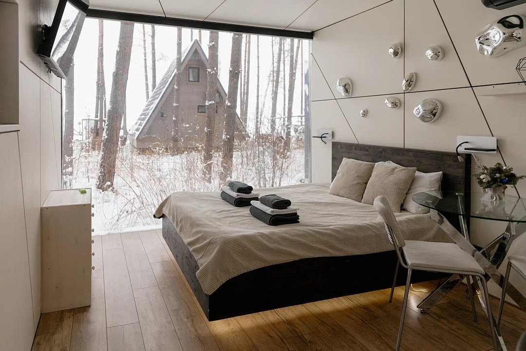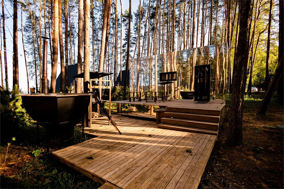 Полностью зеркальный панорамный дом укроет Вас от посторонних взглядов. Это - новейший из наших проектов, единственный в области домик, который буквально растворяется в природе. Уникальная стена из цельного безрамного стекла не оставит никого равнодушным, панорама обеспечивает полное слияние с природой и позволяет наслаждаться живописными видами. Для постройки дома использовались исключительно натуральные материалы. Дом рассчитан на пребывание двух человек. Несмотря на свои внешние габариты, внутри домик очень просторный - в Вашем распоряжении кровать, санузел, кухня, столовая зона. (ЗАЕЗД с 14:00 ВЫЕЗД до 12:00)Услуги и удобства