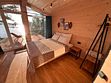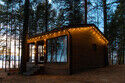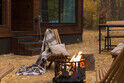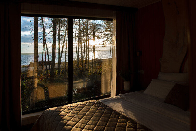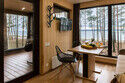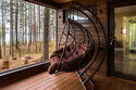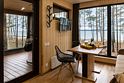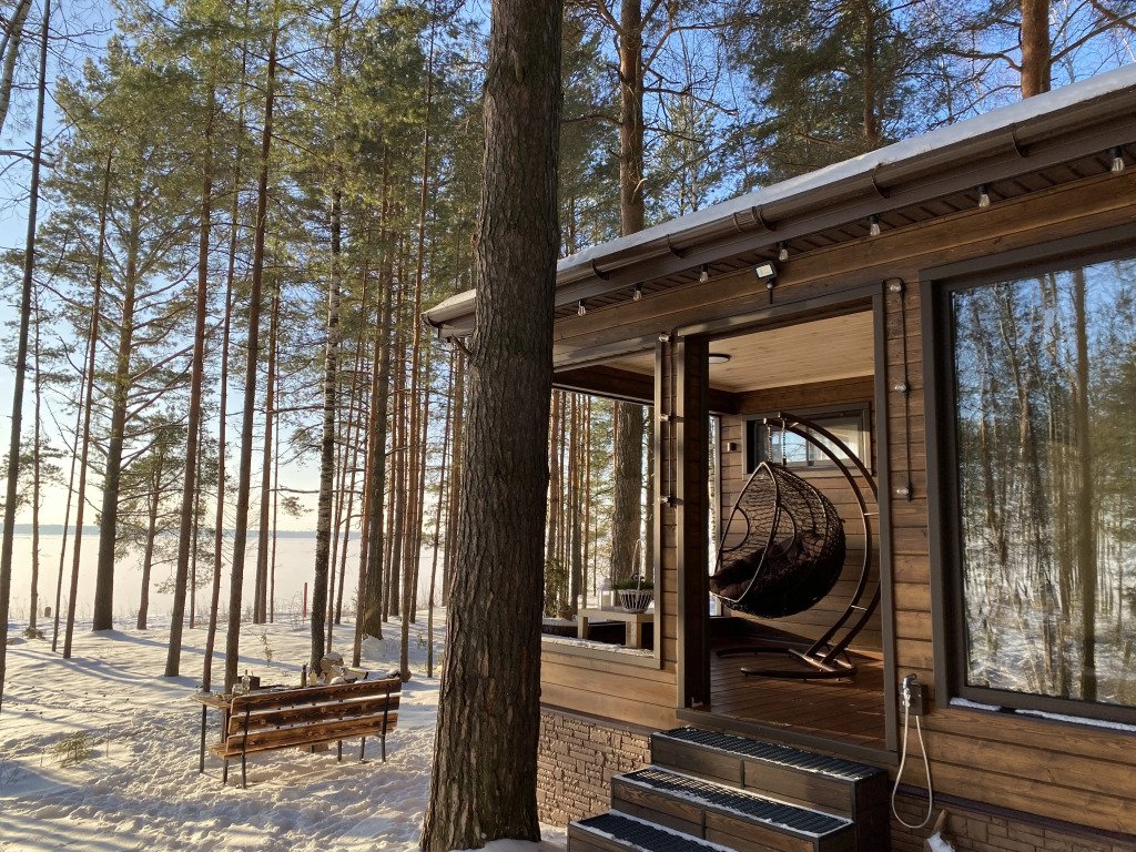 Парящая над сосновым лесом и речными волнами веранда с двухместным креслом-гнездом, панорамные окна в гостиной и спальне, большая кровать с ортопедическим матрасом, полностью оборудованная кухня, уютная костровая зона и песчаный пляж буквально в двух шагах.