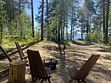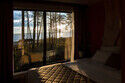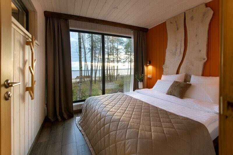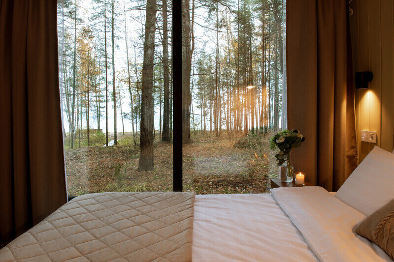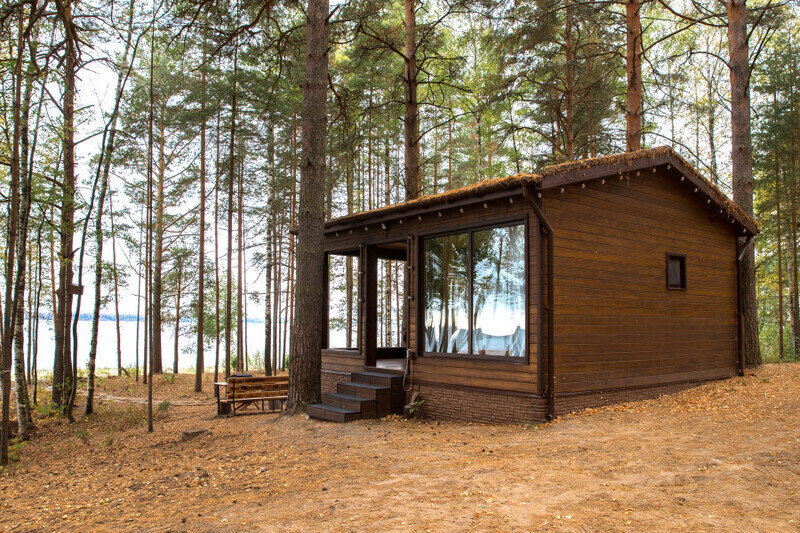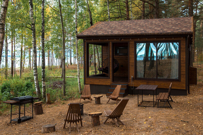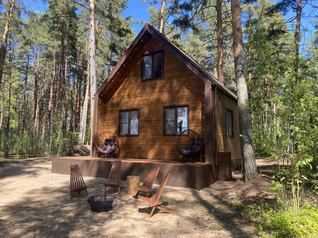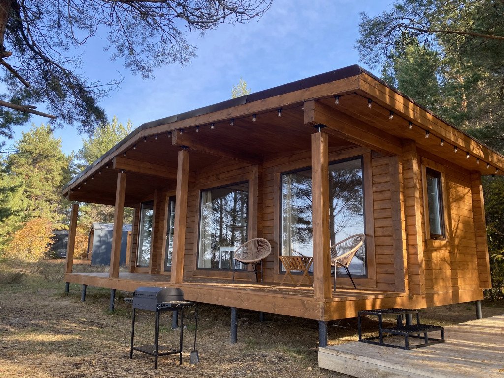 Парящая над сосновым лесом и речными волнами веранда, панорамные окна в гостиной и спальне, большая кровать с ортопедическим матрасом, полностью оборудованная кухня, уютная костровая зона и песчаный пляж буквально в двух шагах.
