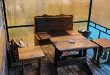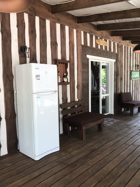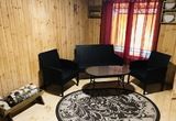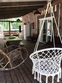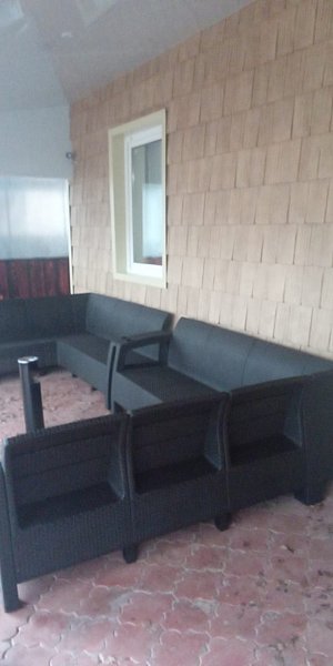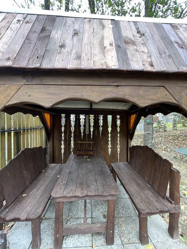 Двуспальный диван и кресло кровать, микроволновка, чайник, холодильник, москитные сетки, мангал с крышей и освещением, душ, туалет.