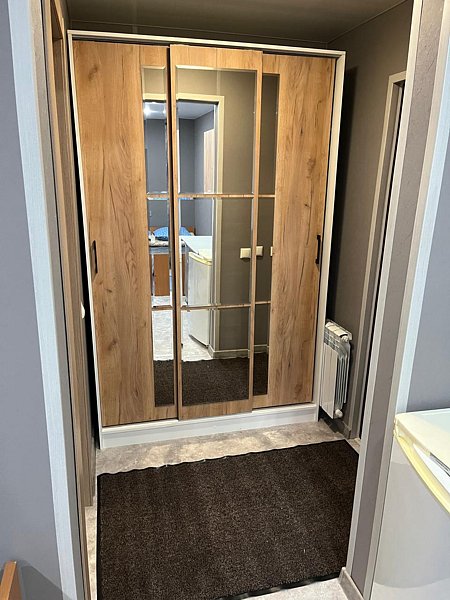 Гриль, диван, туалет, раковина, душ, чайник, микроволновая печь, холодильник, посуда, двуспальный евро диван, односпальные кровати.