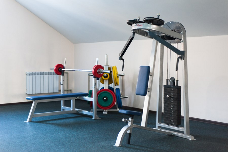 Профессиональный тренажерный зал с вежливыми инструкторами, полным комплектов тренажеров и гирь, с беговыми дорожками, велотренажерами, тренажерами лыжи, боксерским рингом и грушами для битья.