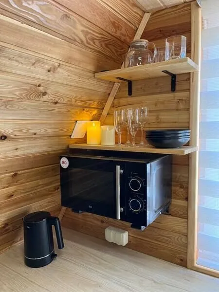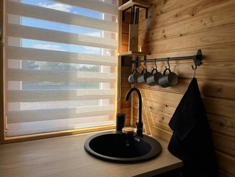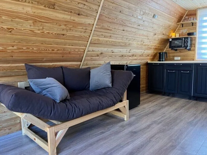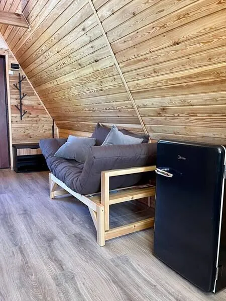 Внутреннее пространство дома включает в себя спальню с двуспальной кроватью, а также гостиную зону с раскладным диваном-кушеткой. Кроме того, здесь есть полностью оборудованная кухня и собственная ванная комната, что обеспечивает максимальную самостоятельность и независимость отдыхающих.