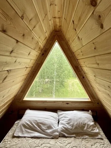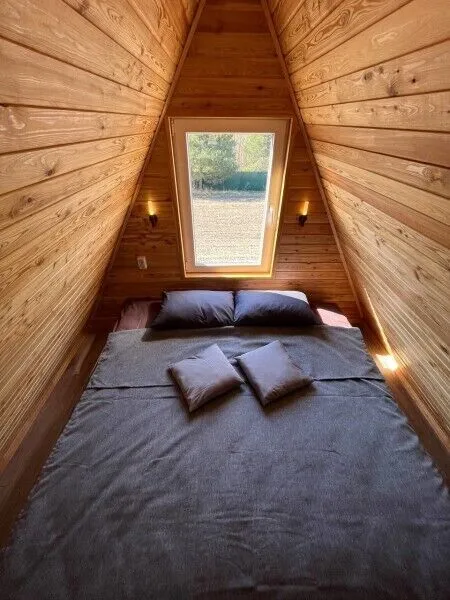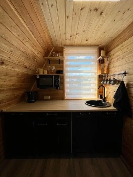 Внутреннее пространство дома занимает три этажа. На первых двух этажах расположены две просторные спальни с двуспальными кроватями, а на мансардном этаже — две дополнительные односпальные кровати. Кроме того, в домике есть полностью оборудованная кухня и собственная ванная комната, обеспечивающие гостям максимум комфорта и независимости.
