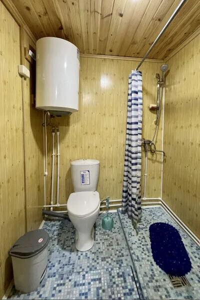 О домиках. С виду они все одинаковые, разве что не везде есть балконы. Три этажа, кухня, туалет, и рядом с каждым – беседка. Внутри чисто, приятно, качественная мебель и сантехника, горячая вода; есть посуда, питьевая вода. Туалет и душевая совместные, буквально 4 квадратных метра, но этого хватает. Кстати, в каждом домике свой wifi с хорошим интернетом.