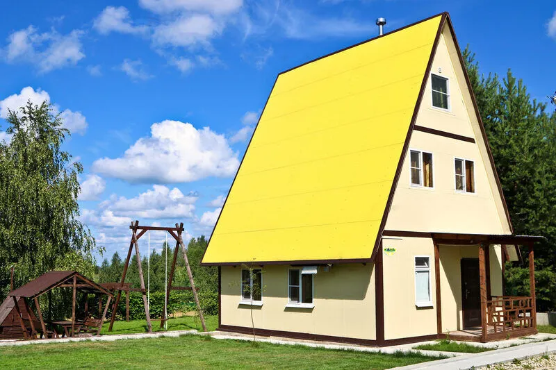 Для проживания большой семьи или веселой компании друзей предлагается вместительный трехэтажный коттедж, выполненный в стиле А-фрейм.