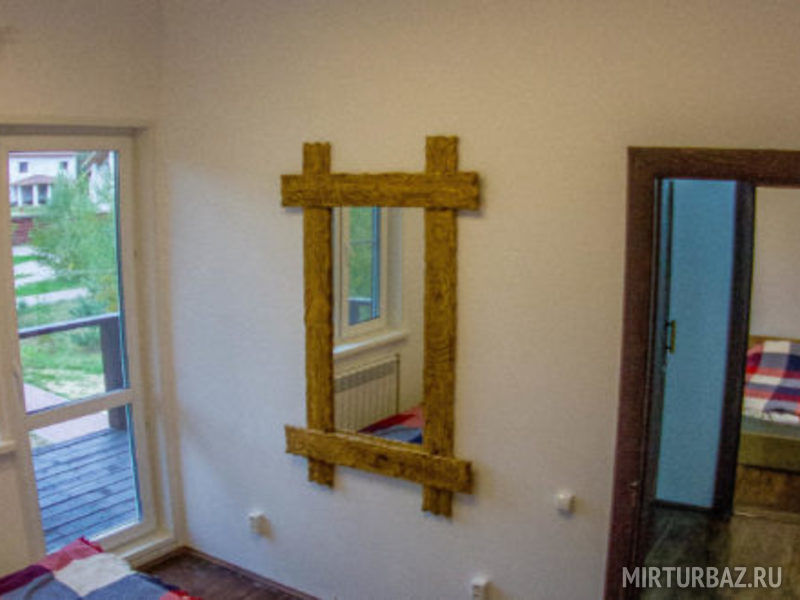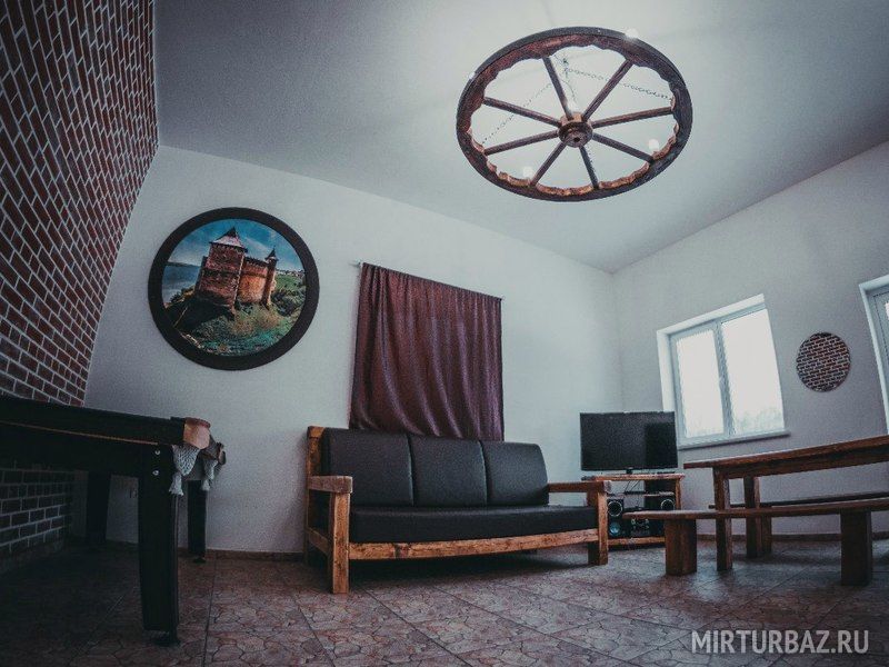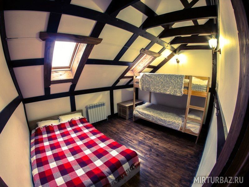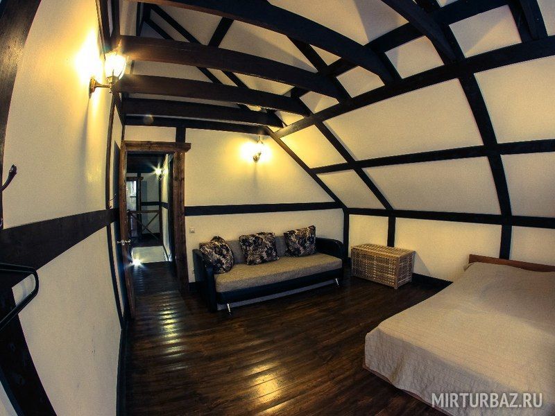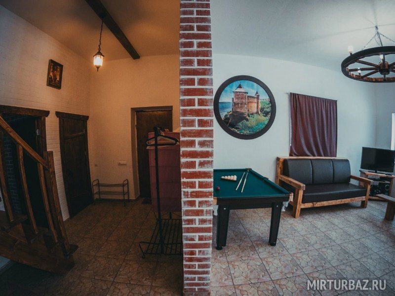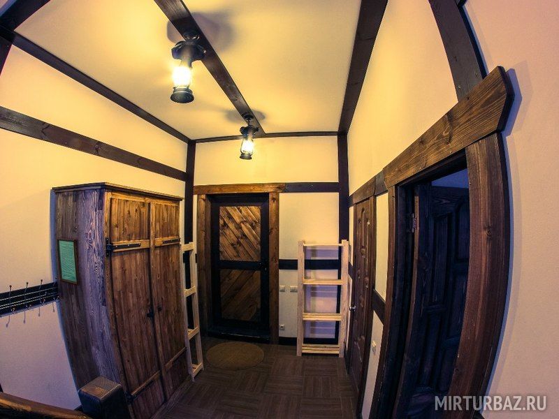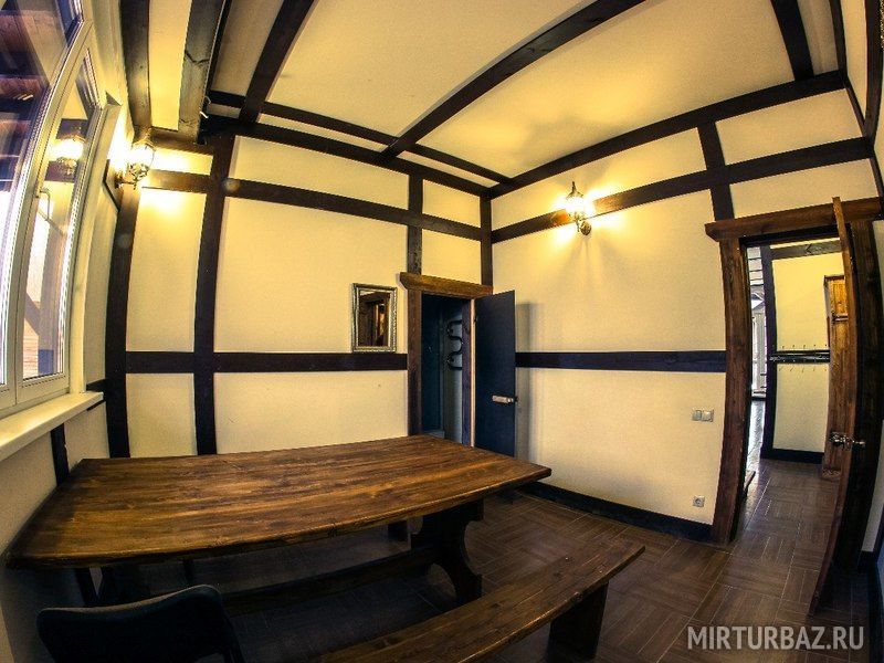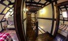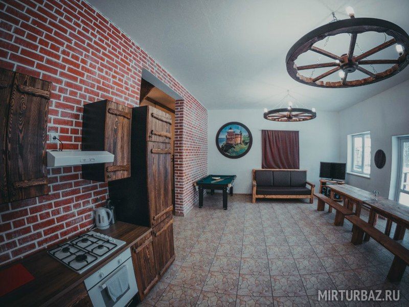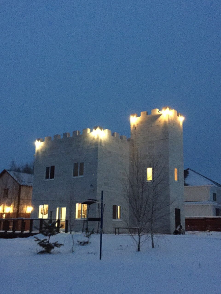 - средневековая башня с винтовой лестницей и смотровой площадкой, откуда открывается умопомрачительный вид на природные окрестности. Все в этом коттедже носит «брутальный характер». Это в первую очередь эксклюзивная мебель ручной работы : двухъярусные двуспальные кровати, на которых не стыдно было бы предложить переночевать царской особе, гостиная с кирпичными стенами, массивный сундук, огромные люстры-колеса со свечами, создающие таинственную замковую атмосферу.Теплые полы на первом и втором этажах, своя котельная и скважина