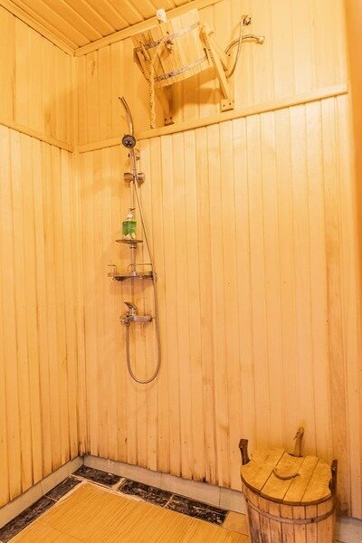 Сауна в Ласточкином Доме рассчитана на посещение компанией 8 человек. В ней большая парная с газовой печкой, комнатой отдыха, своим санузлом и душевой комнатой. Есть контрастное ведро-обливалка для любителей экстрима.