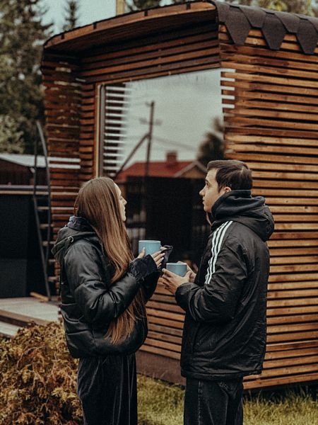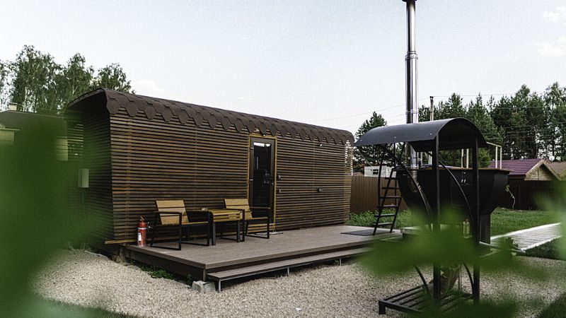 Для желающих расслабиться у каждого домика есть доступ к сибирскому банному чану, где горячая запарка из трав наполняет воздух успокаивающими ароматами. На террасе созданы условия для непринужденного общения: удобная мебель и теплые пледы создают атмосферу уюта под открытым небом.
