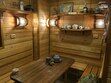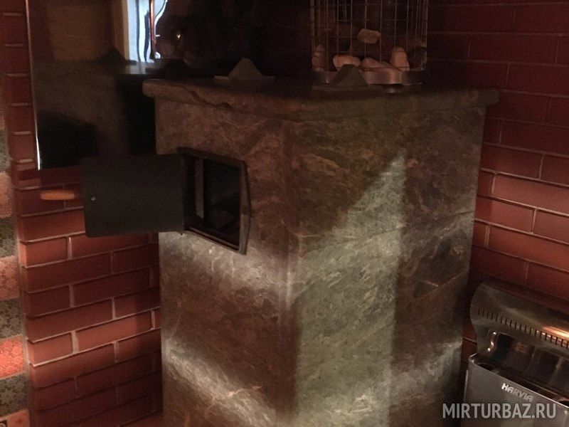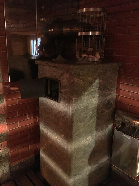 Из-за конструктивных особенностей печки ее масса составляет полторы тонны, это чугунная печь российского производства, марки «Гефест» и обкладка плитами только хлорида привезенным из Карелии. Парная отделана разными видами дерева, начиная с Сибирского кедра, лиственницы, ольхи, липы, осины и заканчивая Абхазским буком и Африканским дубом Абаш. Что в совокупи придает уютную и расслабляющую обстановку. Инсталляция из керамических плиток ручной работы подчеркивает индивидуальность парной. Предусмотрена постоянная приточка свежего воздуха и хорошая вентиляция, что позволяет Вам дольше париться. Комната отдыха выдержанна в светлых тонах , что благоприятно влияет на состояния человека, а дружеская беседа за столом с кружкой пива поднимет Вам настроение. В душевой кабине есть гидромассаж ,для любителей освежиться ведро с холодной водой или прыгнуть с пирса в Волгу, а для полного расслабления горячая ванна с Крымской солью. Приятным бонусом везде теплые полы.
