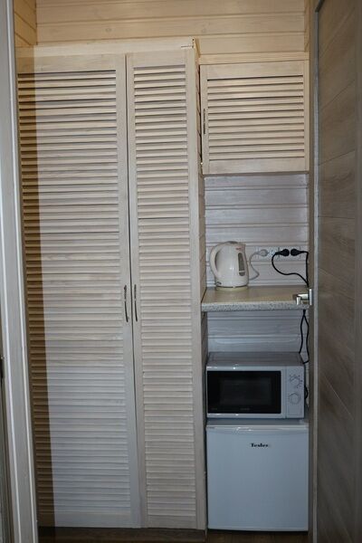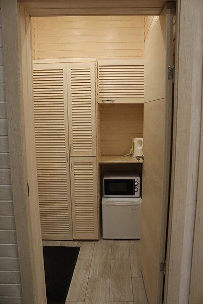 - кухня: холодильник, печь СВЧ, электрический чайник, столовые приборы;