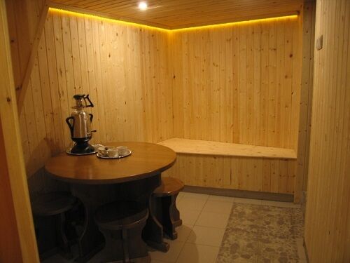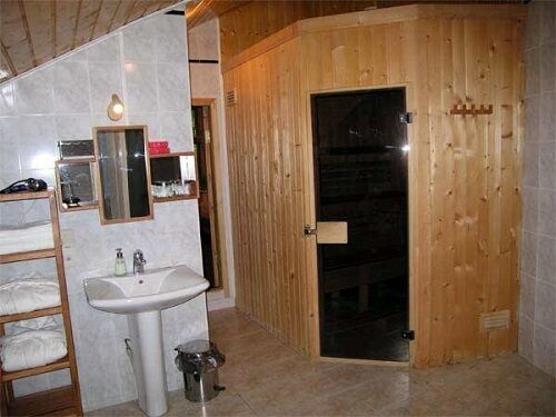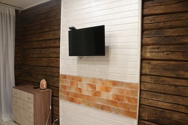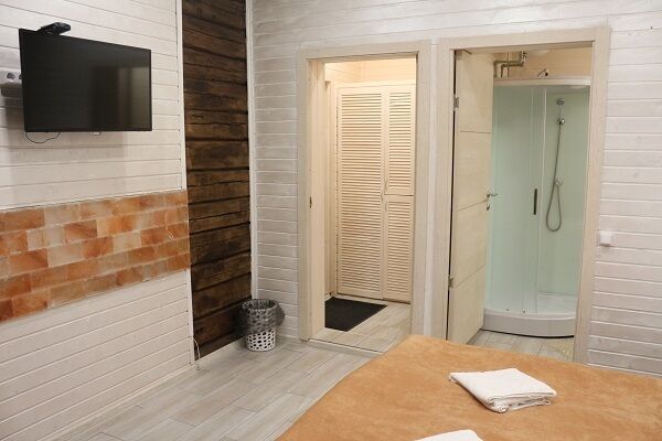 Домик Люкс «Соляная комната» — это экологически чистый бревенчатый сруб. В номере органично сочетаются натуральные материалы и современный дизайн. Преимуществом данного домика является уникальная соляная панель, которая дает приглушенный свет и насыщает воздух полезными элементами, которые благоприятно для людей с заболеваниями астмы, при аллергии, а также при нервозности и депрессивном состоянии.