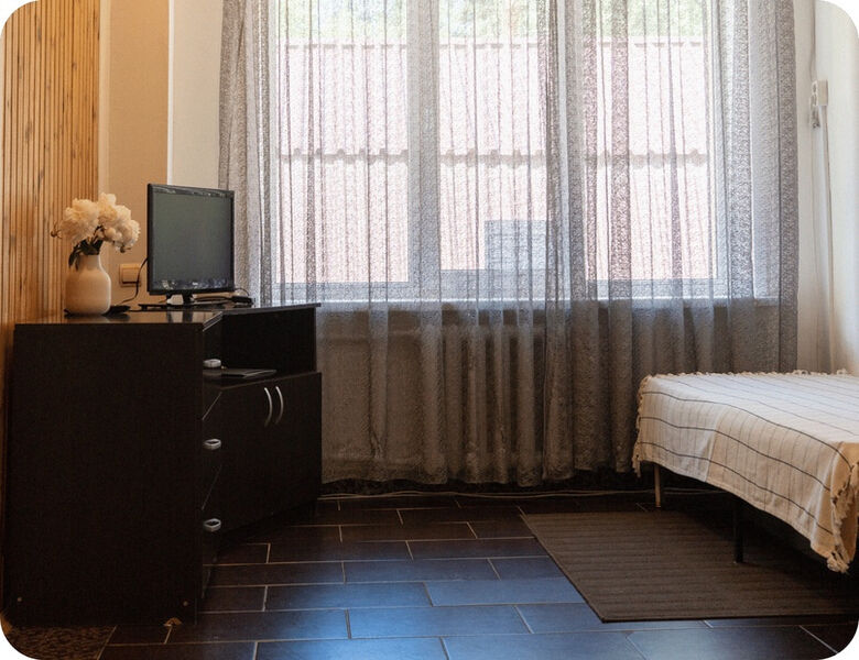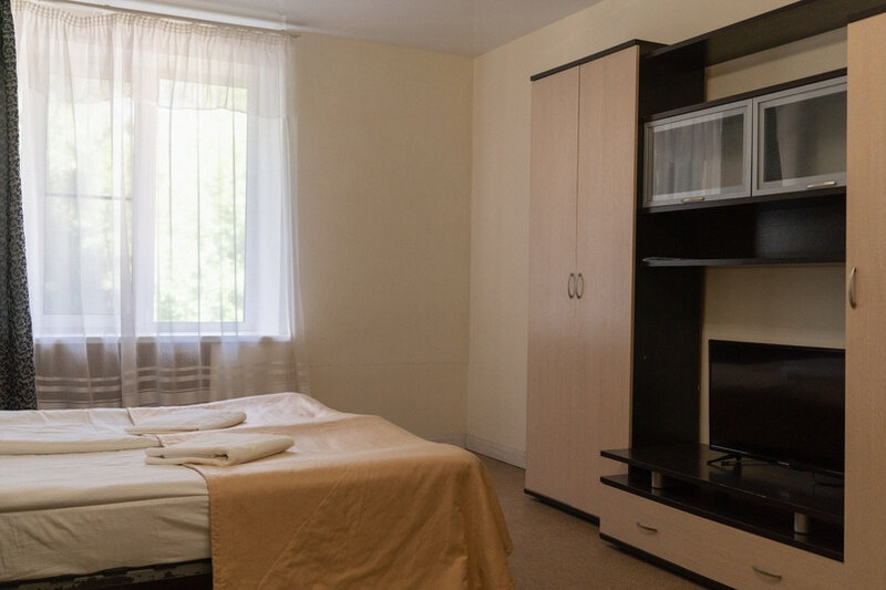 - оснащение: полутороспальная кровать - 2 шт., комод, шкаф, кресло, журнальный столик, соляная светодиодная панель, телевизор.