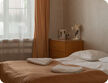 2 полутороспальные кровати, кресло, комод, встроенный шкаф, телевизор, туалет, душ, умывальник, зеркало, окна стандартные, пол линолеум.