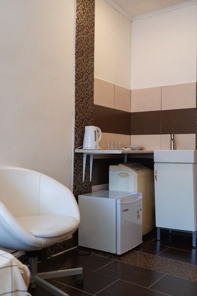 - кухня: холодильник, печь СВЧ, электрический чайник, столовые приборы, кухонная столешница, раковина с тумбой;