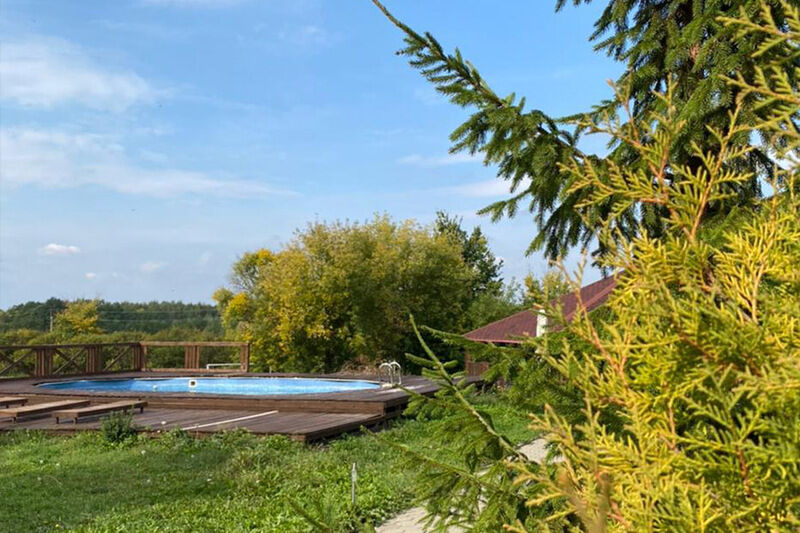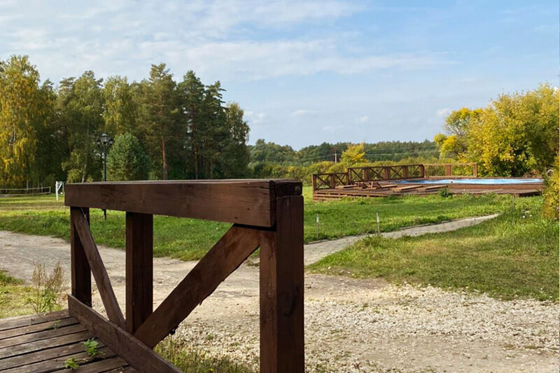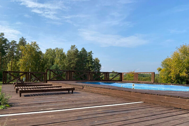 Мощеная дорожка, окруженная ярко-зеленой лужайкой, бассейн с деревянным настилом по периметру и завораживающие природные ландшафты украсят ваши свадебные фото и наполнят праздник уютной атмосферой загородного отдыха .