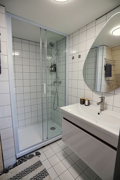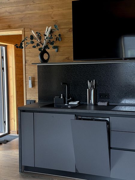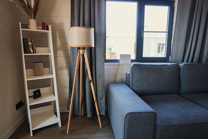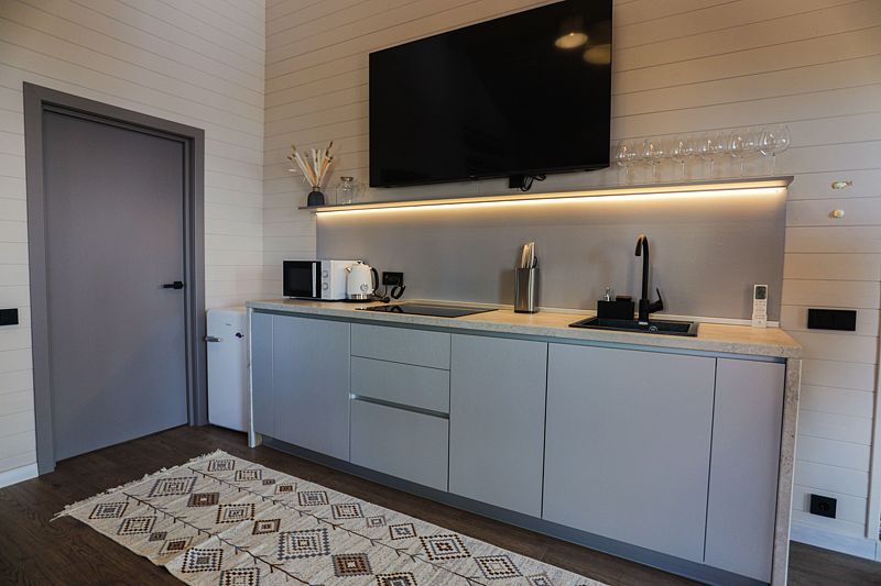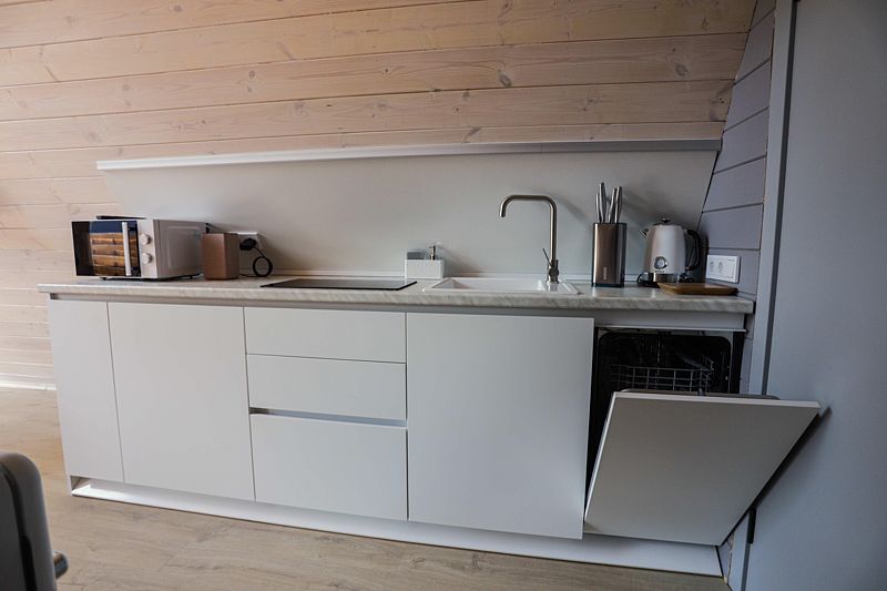 Всё необходимое для комфортного проживания уже предусмотрено: плита, чайник, холодильник, телевизор, кондиционер и посудомоечная машина. Также в общей комнате есть комфортабельный диван.