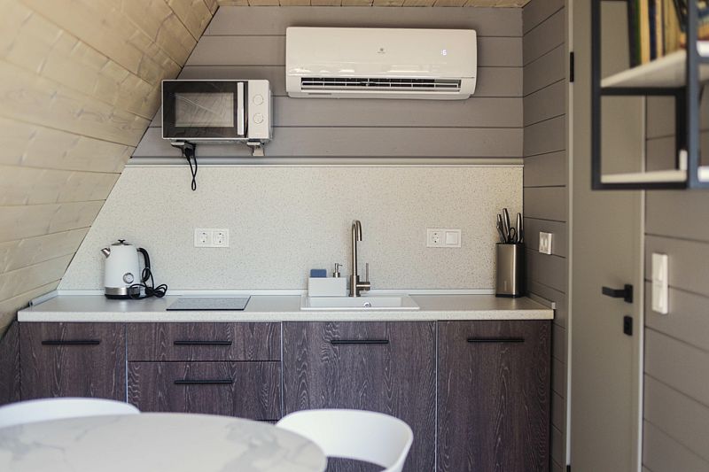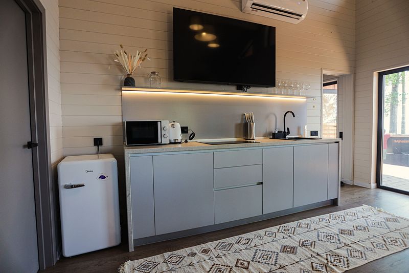В домике есть все необходимое для комфортного проживания: плита, чайник, холодильник, телевизор, кондиционер и посудомоечная машина.