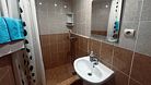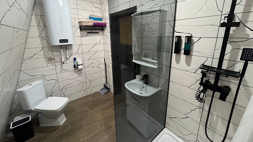 Санузел: душевой блок, умывальник, унитаз, горячая и холодная вода, полотенцесушитель, зеркало.