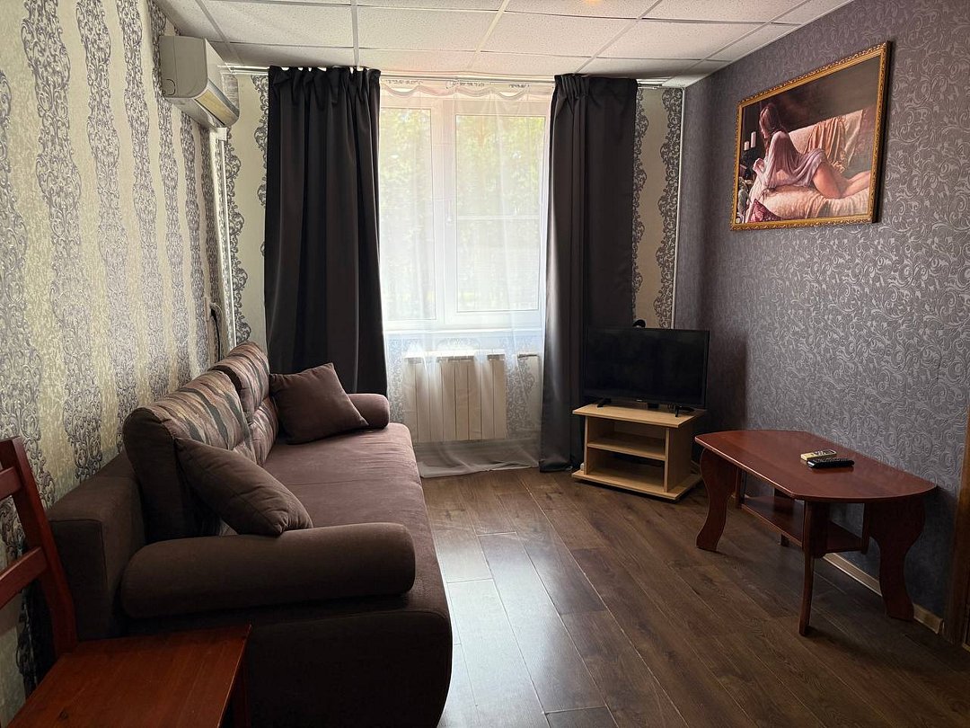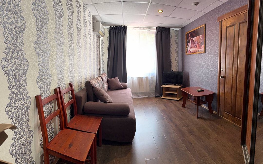 Комната: раскладывающийся двуспальный диван, 2 стула, вешалка для одежды, шкаф, телевизор (спутниковое ТВ), журнальный столик, кондиционер, холодильник с мини-баром.