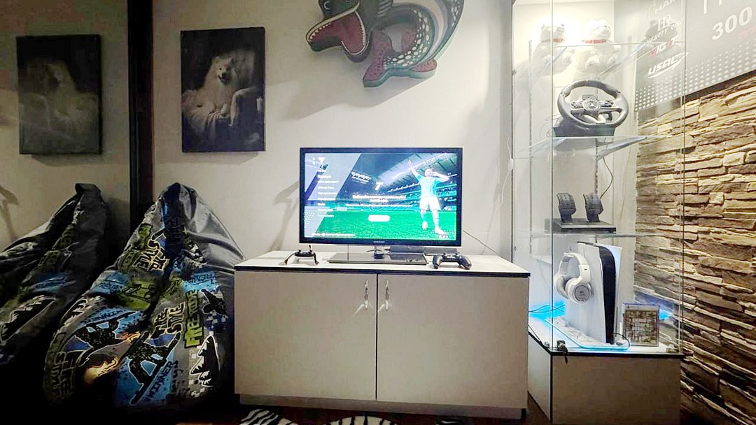 Гостиная: стол со стульями, всё необходимое для приготовления и приёма пищи на 6 персон, холодильник, раскладывающийся диван, вешалка для одежды, Смарт-ТВ, кондиционер.
