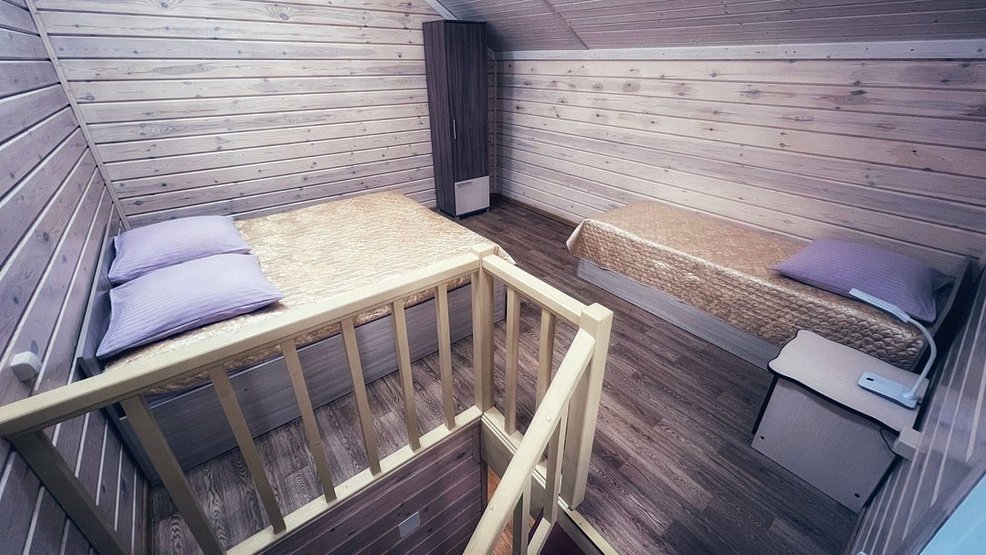 Каждый номер с отдельным входом представляет собой двухкомнатное помещение общей площадью 35 кв.м с собственным санузлом: помещение на первом и спальня на втором этаже. Оптимальный вариант для семейного проживания.