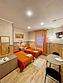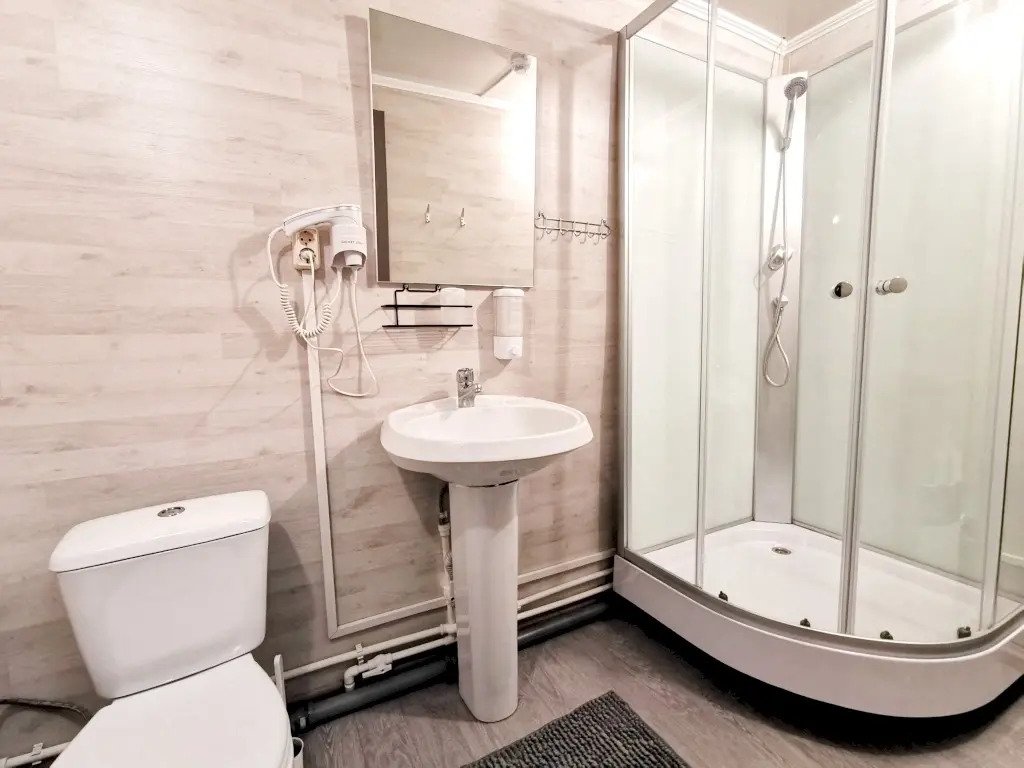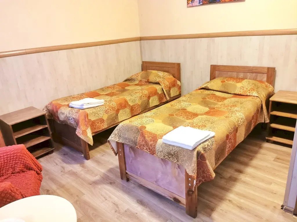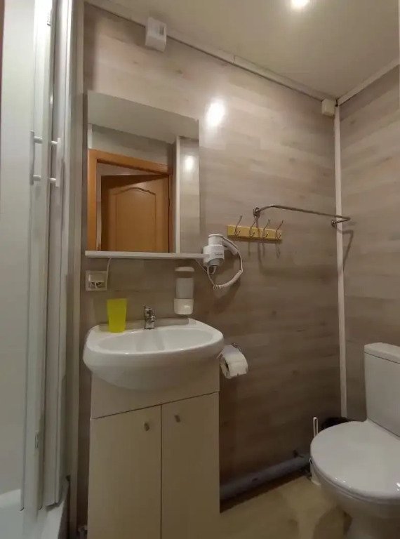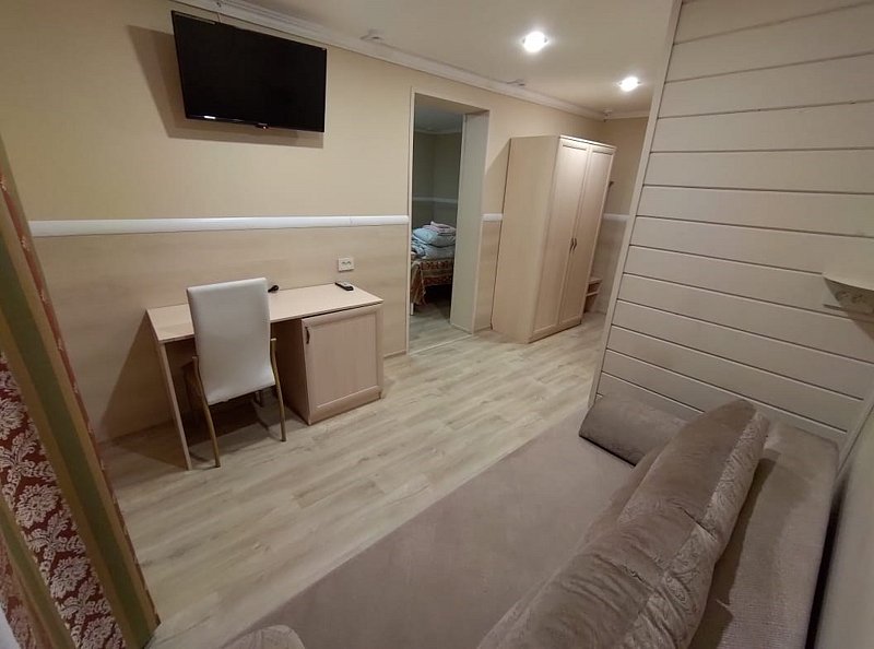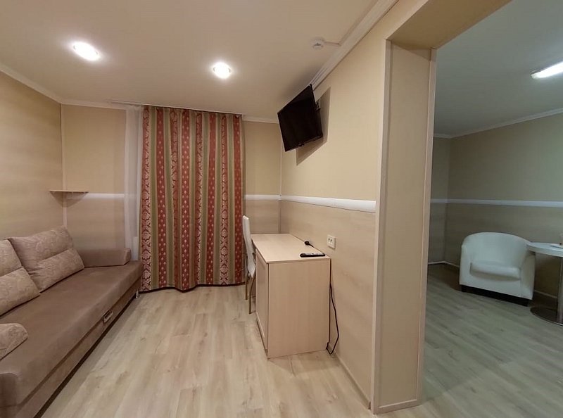 № 1.1.3 Двухкомнатный, 24 м2, основных мест 3. Возможно дополнительное размещение на евро-раскладушке. В номере: спальные места, шкаф, тумбочки, телевизор,туалет и раковина. Холодильник и ванная на блок.